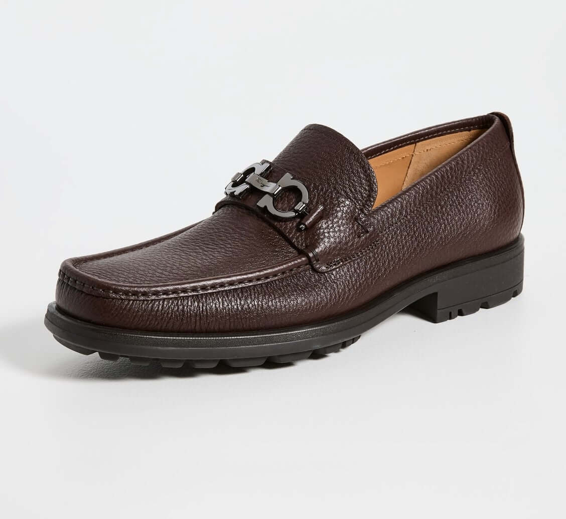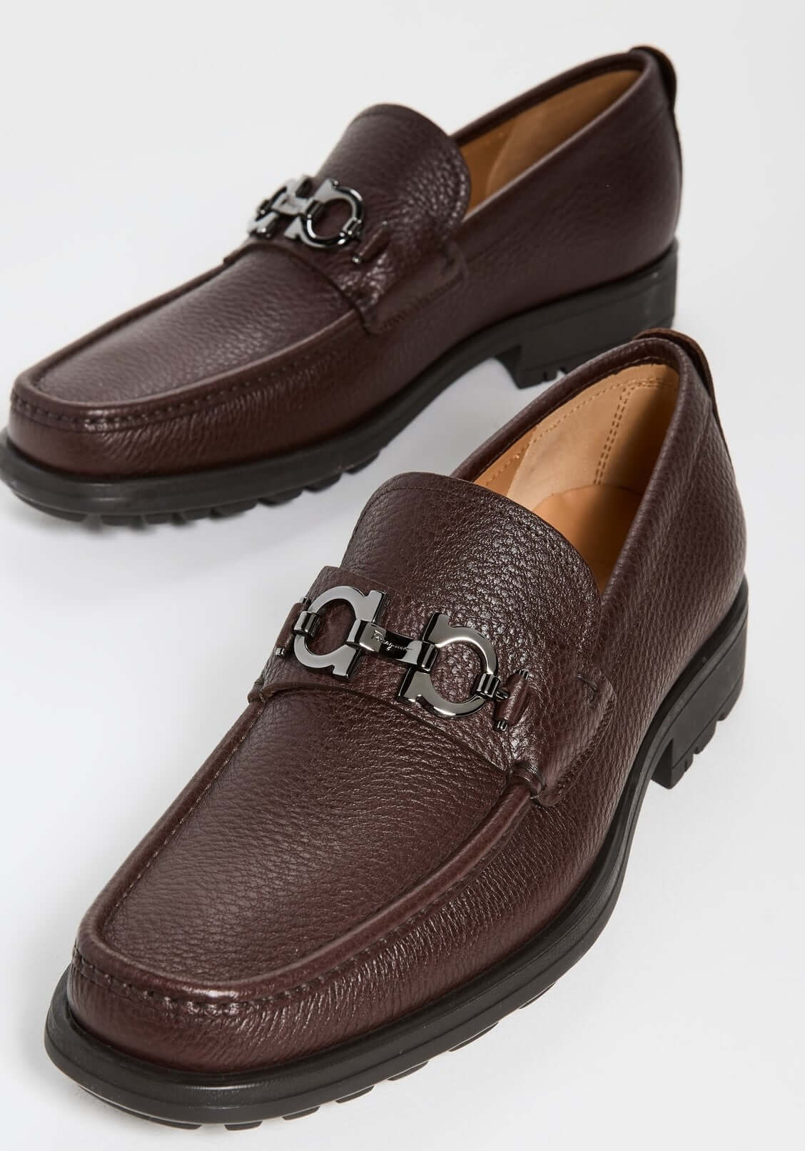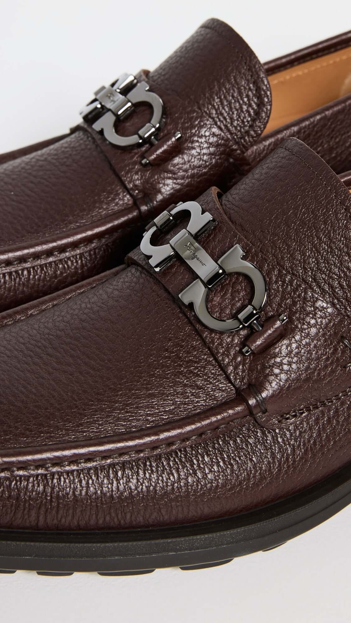 Mocassini Salvatore Ferragamo David, Gancini Ornament da uomo. Realizzato in morbida pelle di vitello martellata, questo mocassino di Ferragamo presenta uno stile slip-on, plastron cucito, ornamento Gancini con finitura rutenio, spessa suola track in gomma, costruzione "Tubolare". Prodotto in Italia.