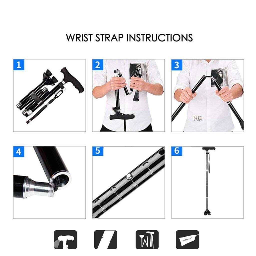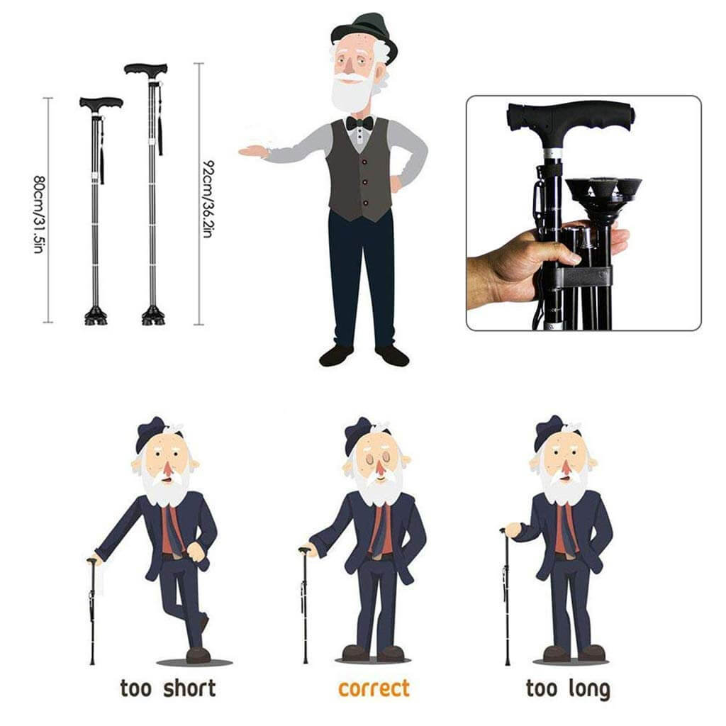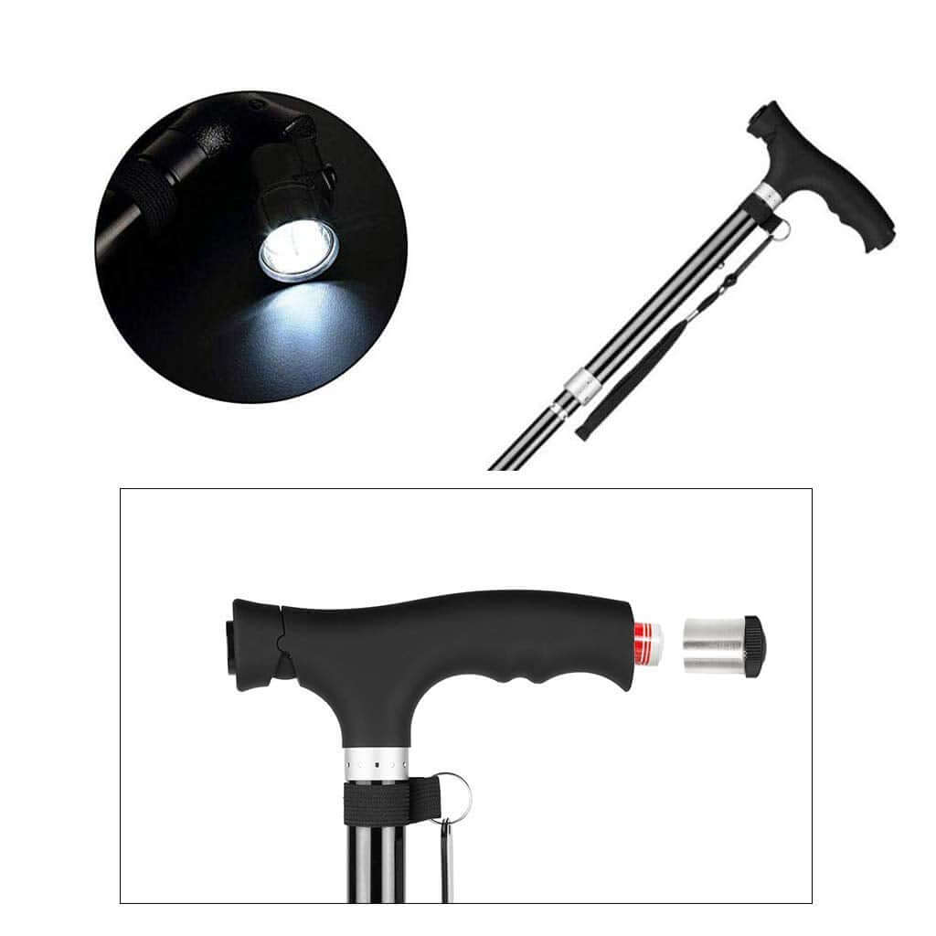 Bastone da passeggio pieghevole per uomo donna - pieghevole, leggero, regolabile e portatile - Equilibrio ausiliario per la mobilità - Maniglie a T nere eleganti e comode con luce