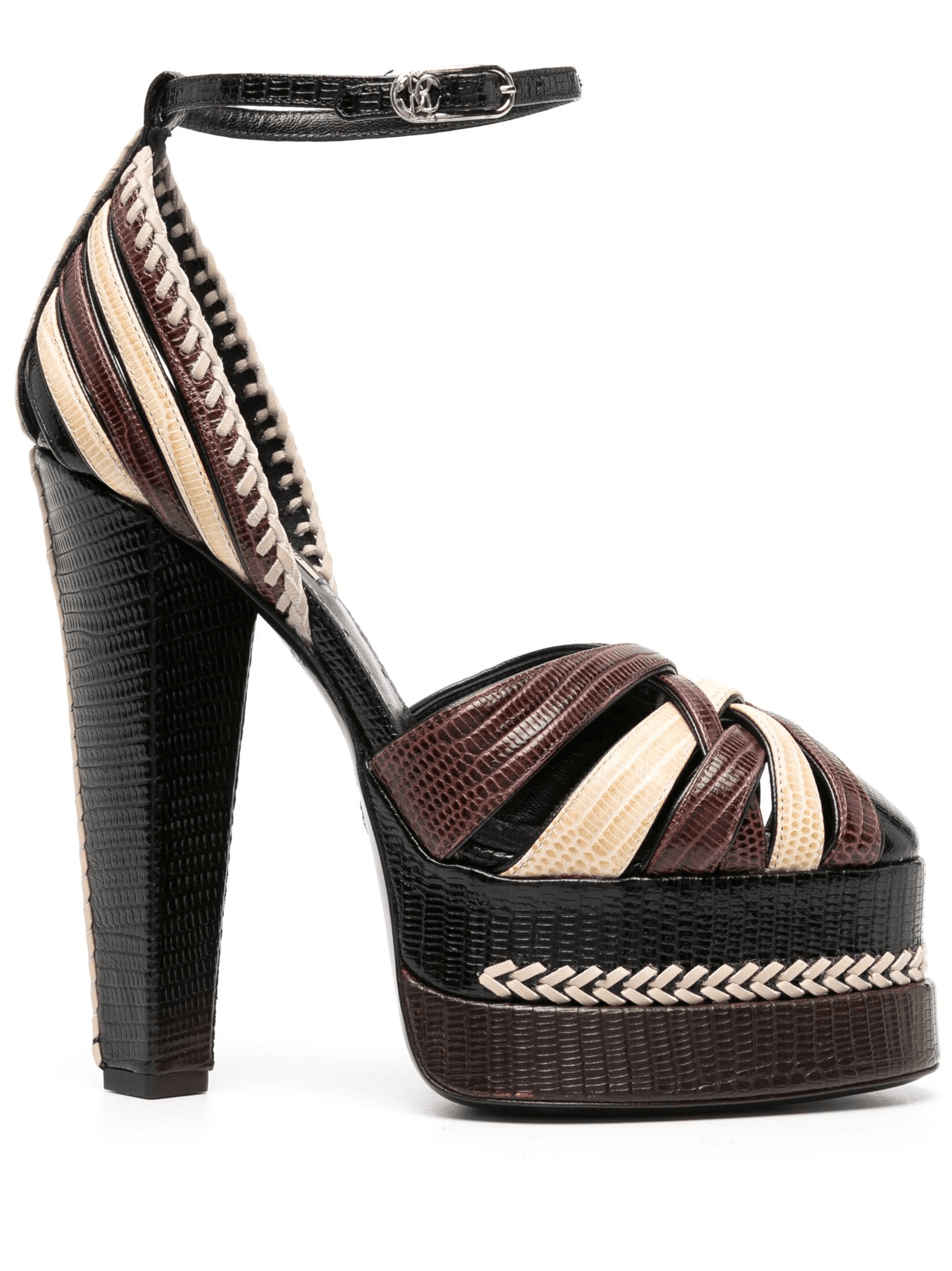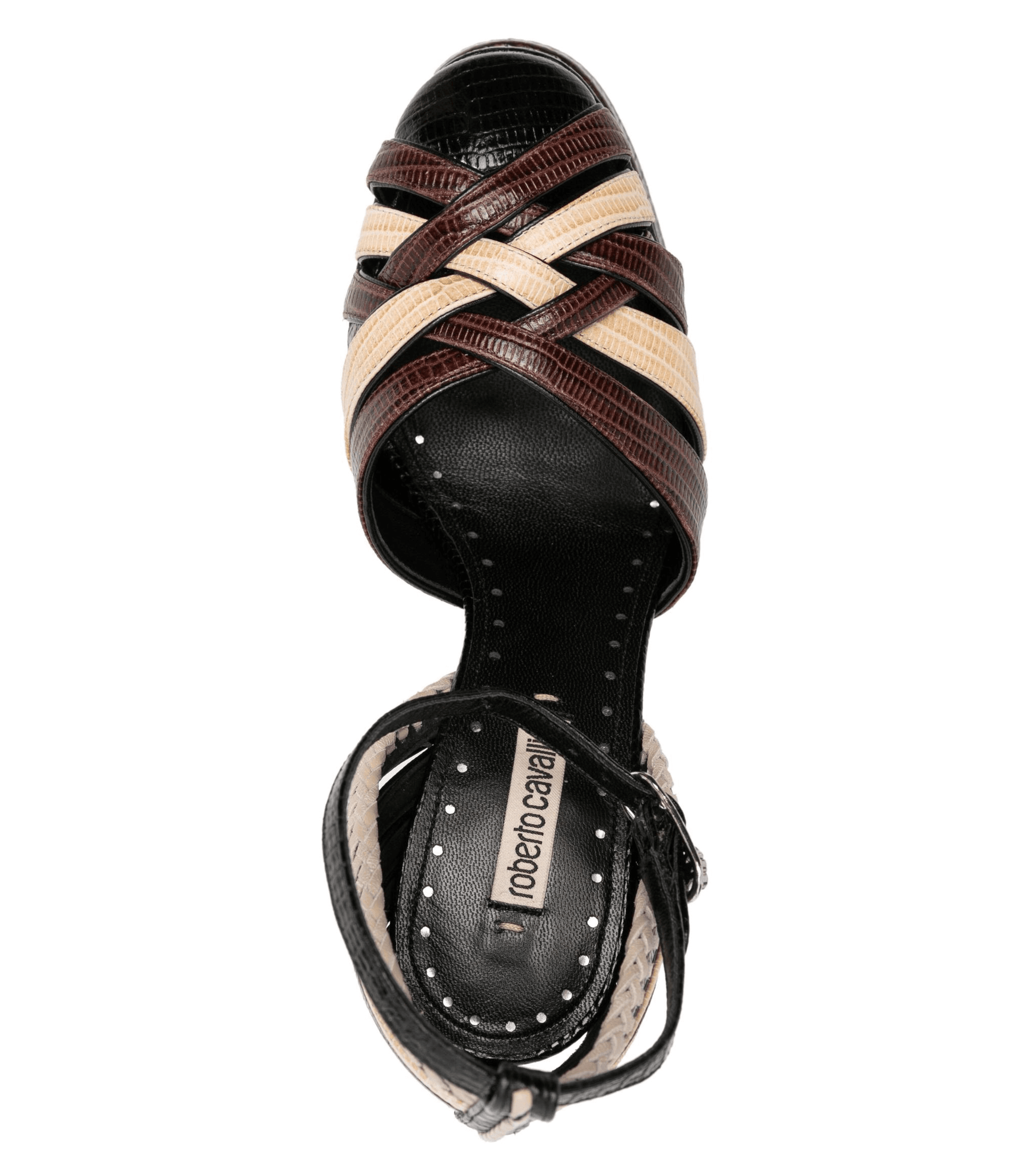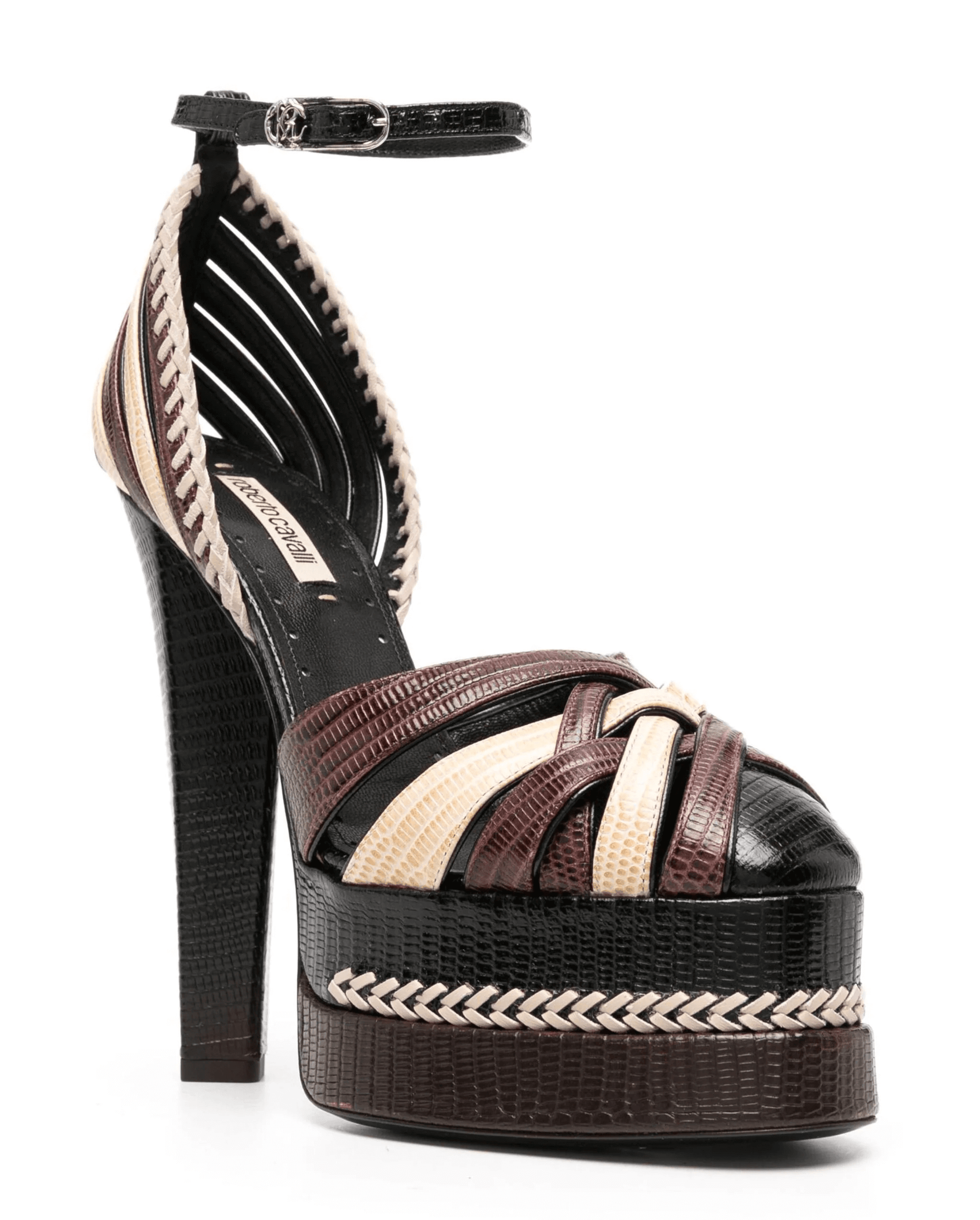 Cioccolato, color sabbia, nero, pelle, effetto pelle di serpente, dettaglio intrecciato, punta tonda, chiusura alla caviglia con fibbia, soletta con logo, plateau e tacco alto a cono.