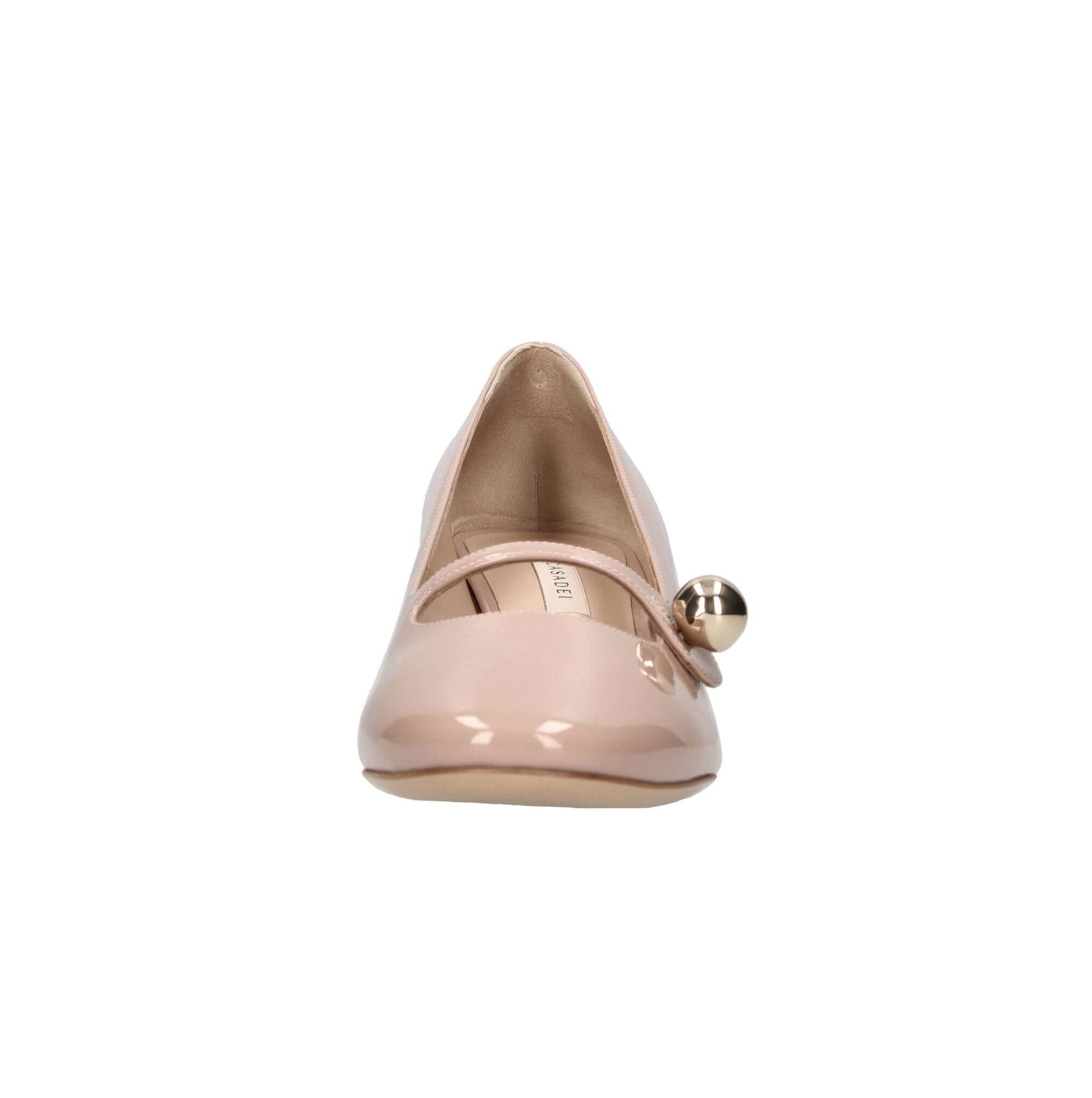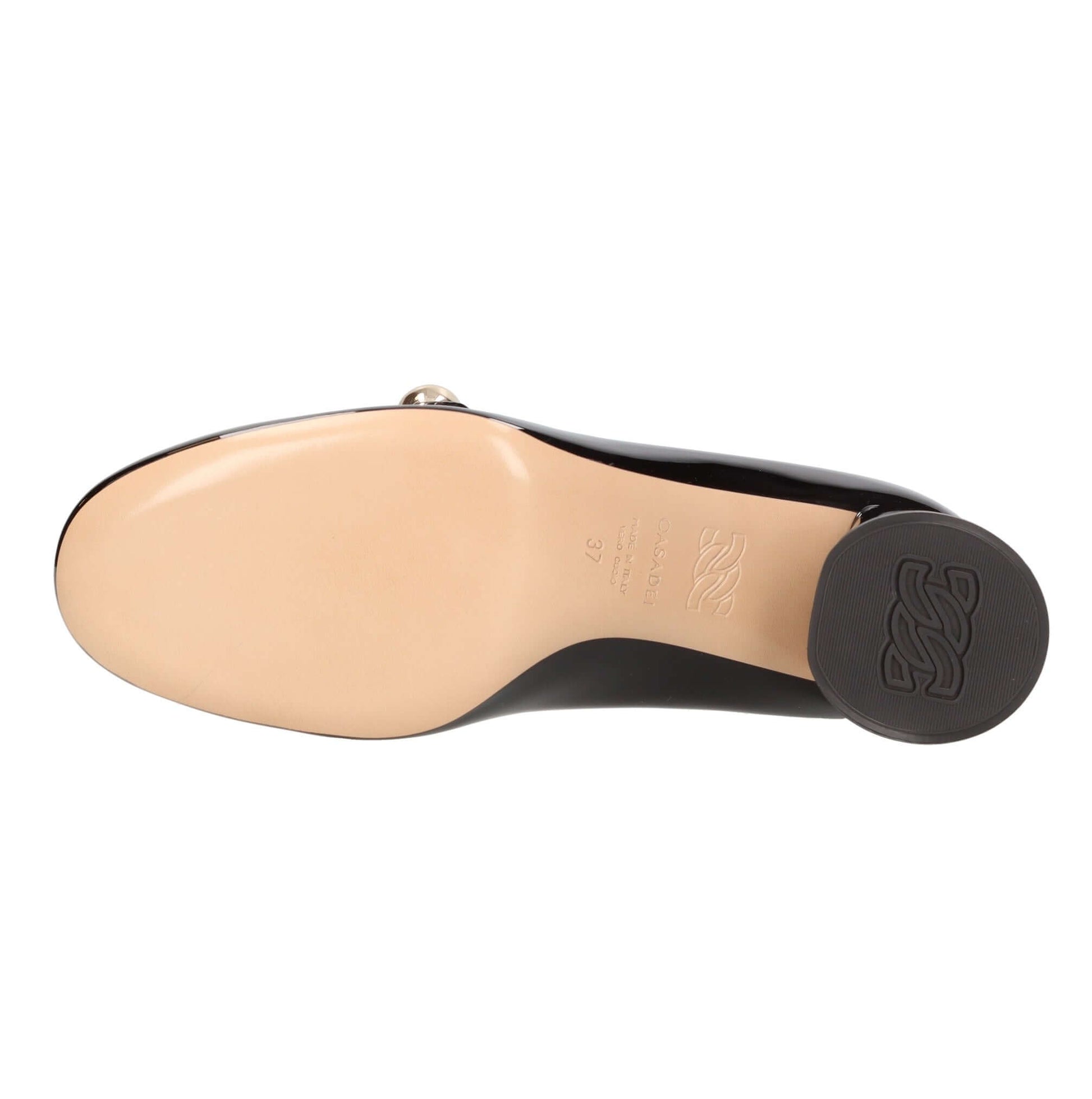 Décoletté modello Mary Jane in vernice. Tacco Cleo. Suola esterna in cuoio logata. Tomaia interna in pelle logata.