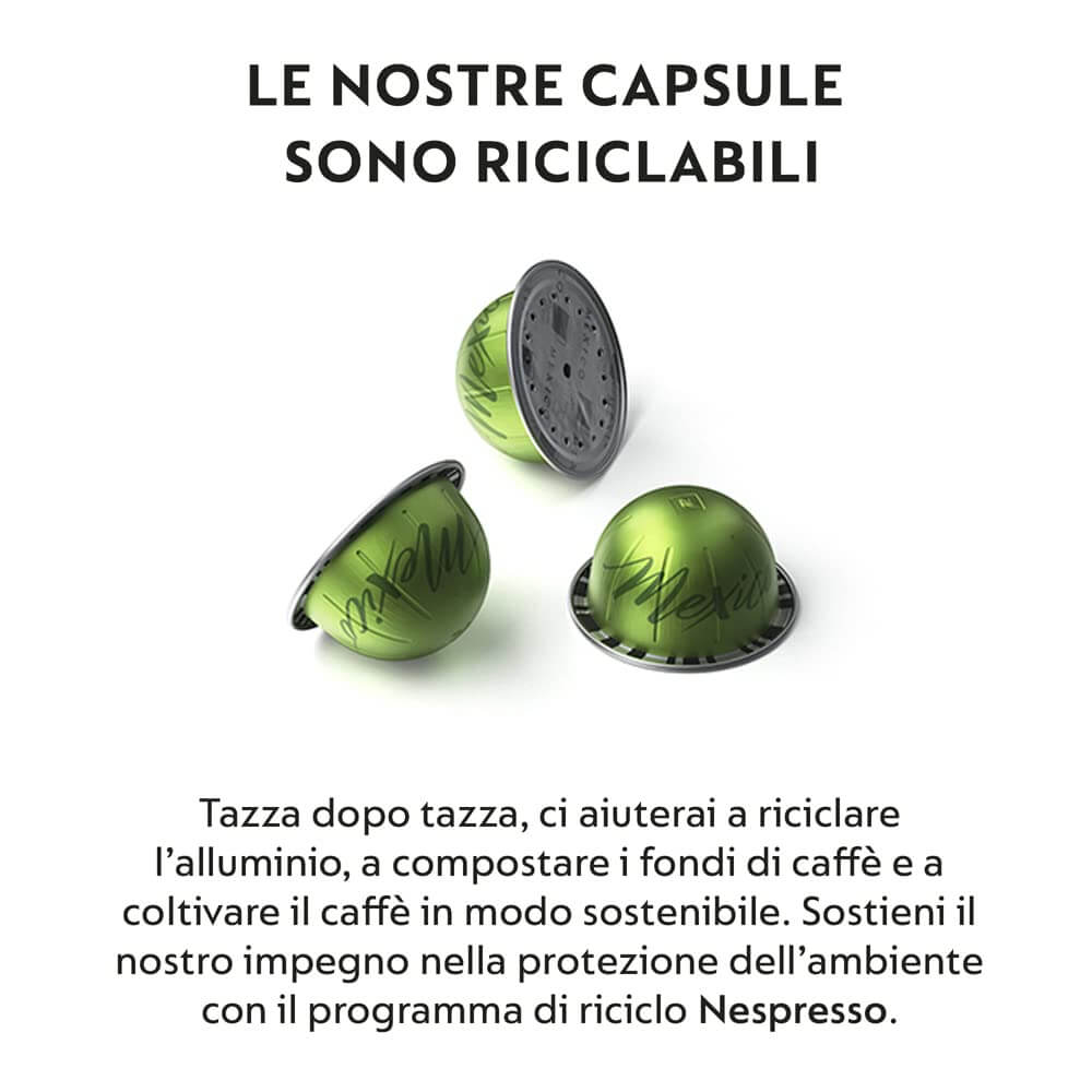 - Le capsule Nespresso in alluminio proteggono gli aromi e la freschezza nel tempo: dal momento in cui il caffè viene tostato e macinato fino in tazza. Almeno l'85% della capsula proviene da alluminio riciclato, un materiale che è riciclabile all'infinito.
