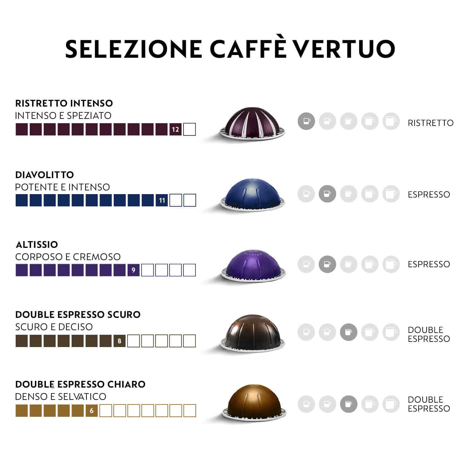 - Vertuo Ristretto Intenso, Altissio e Diavolitto: lunghezza Ristretto (20ml) ed Espresso (40ml), intensità da 9 a 12 (su 12), per caffè con note intense, vellutate e cremose. Vertuo Double Espresso Chiaro e Scuro: lunghezza Double Espresso (80ml), intensità 6 e 8 (su 12), per caffè con corposi e con note aromatiche.