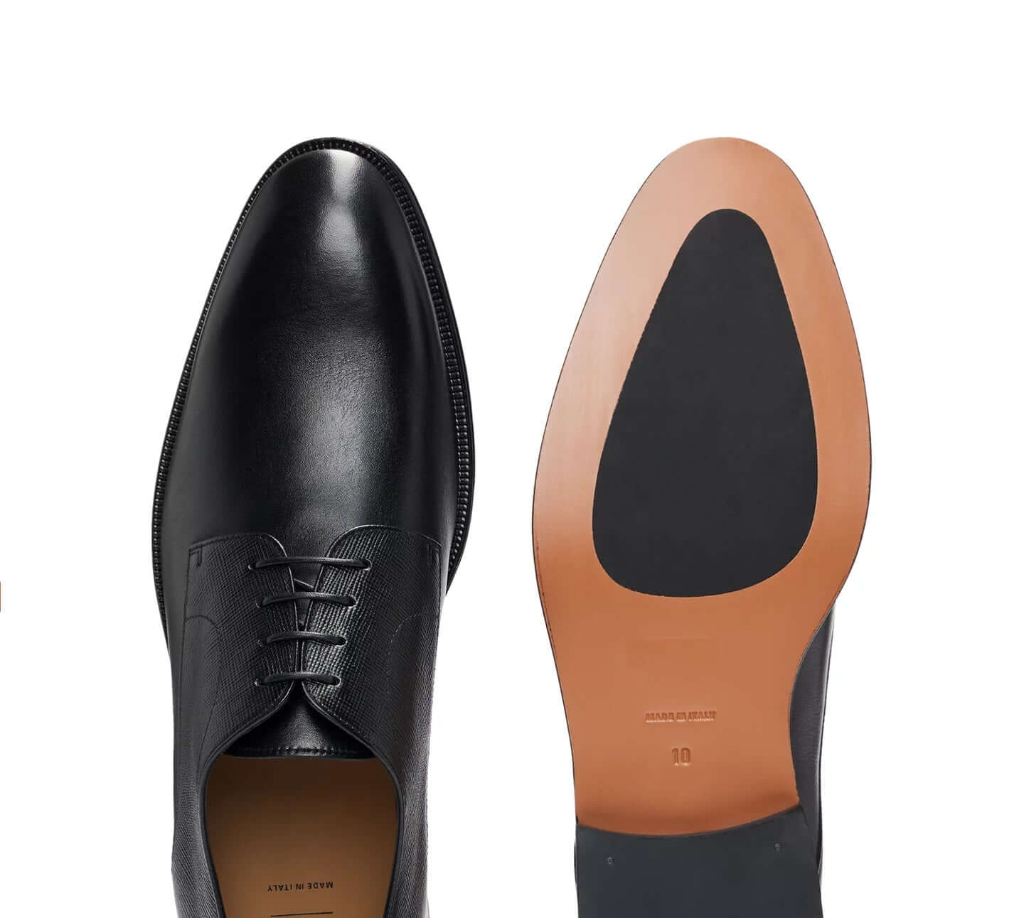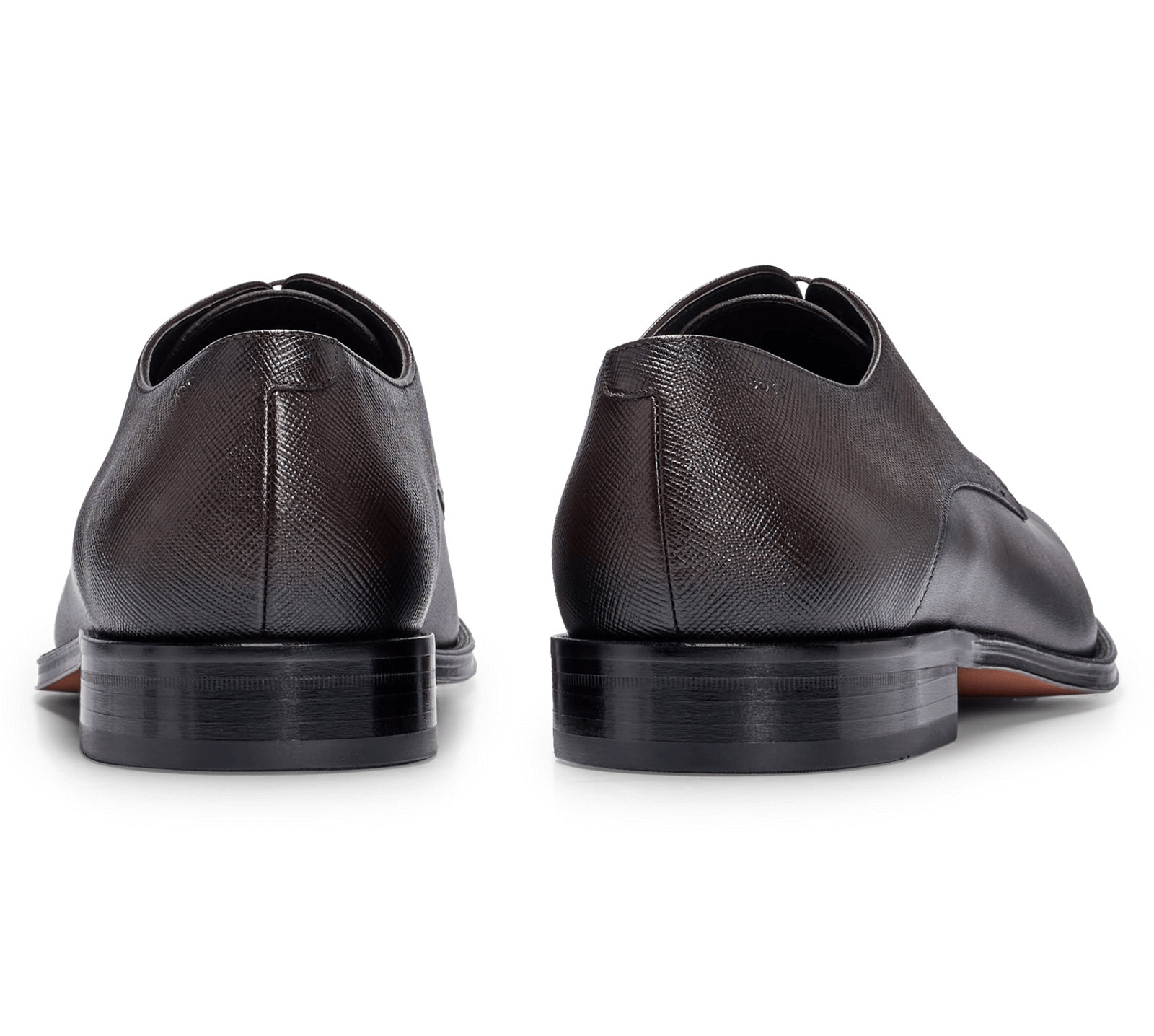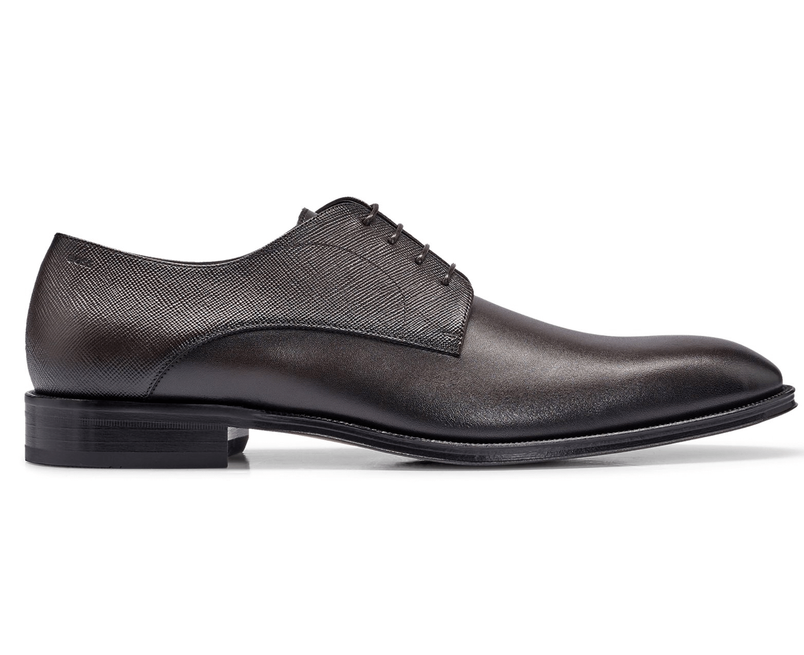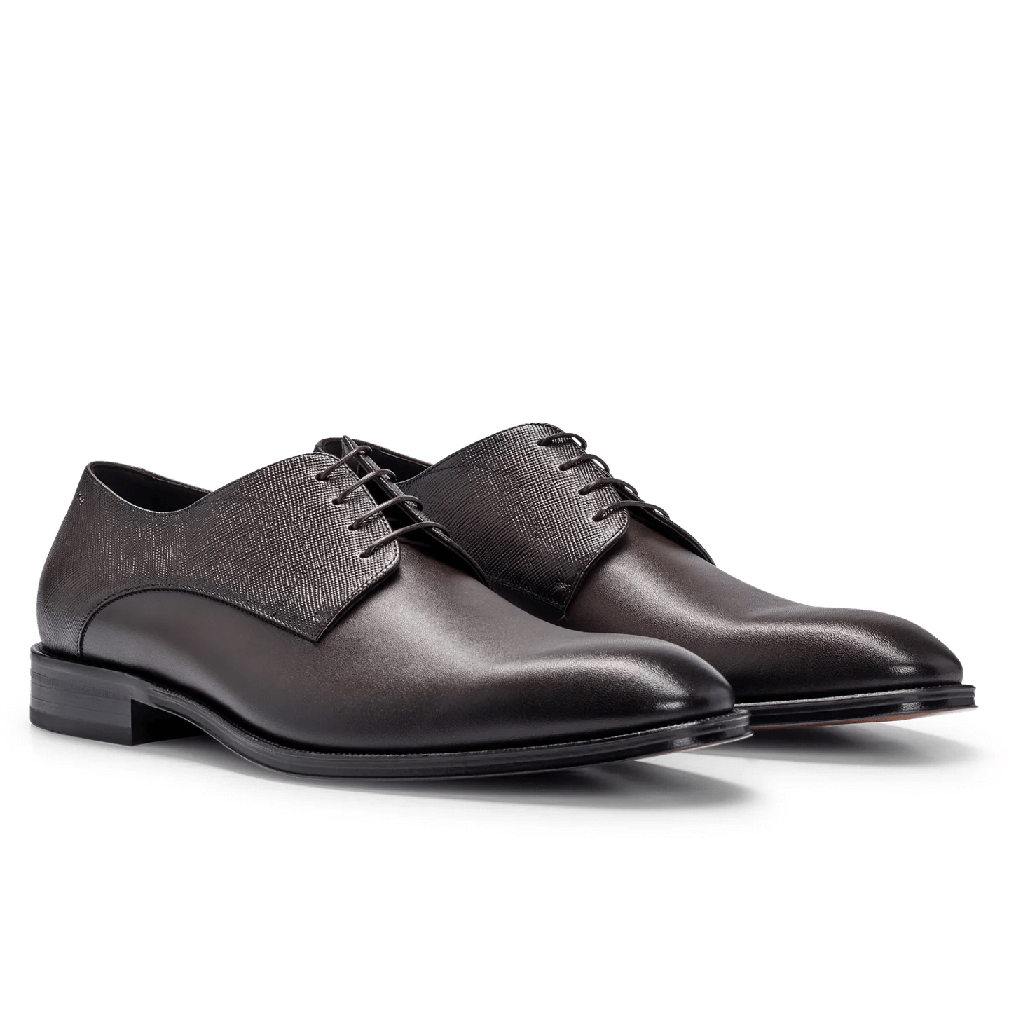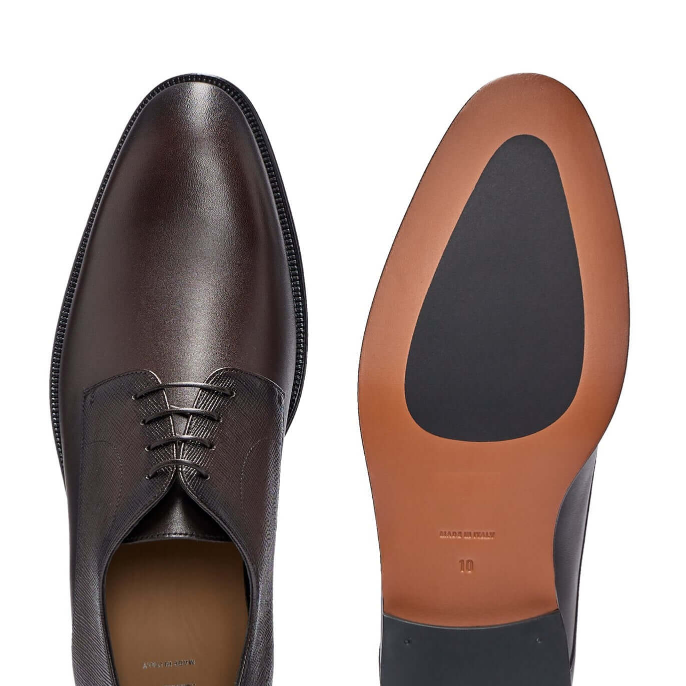 Originali scarpe derby realizzate in Italia in una combinazione di pelle liscia e con stampa Saffiano, dotate di suola con inserti in gomma. Completamente foderato