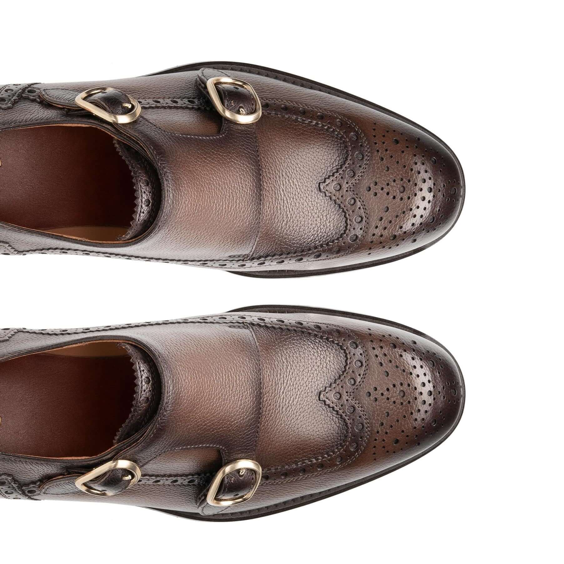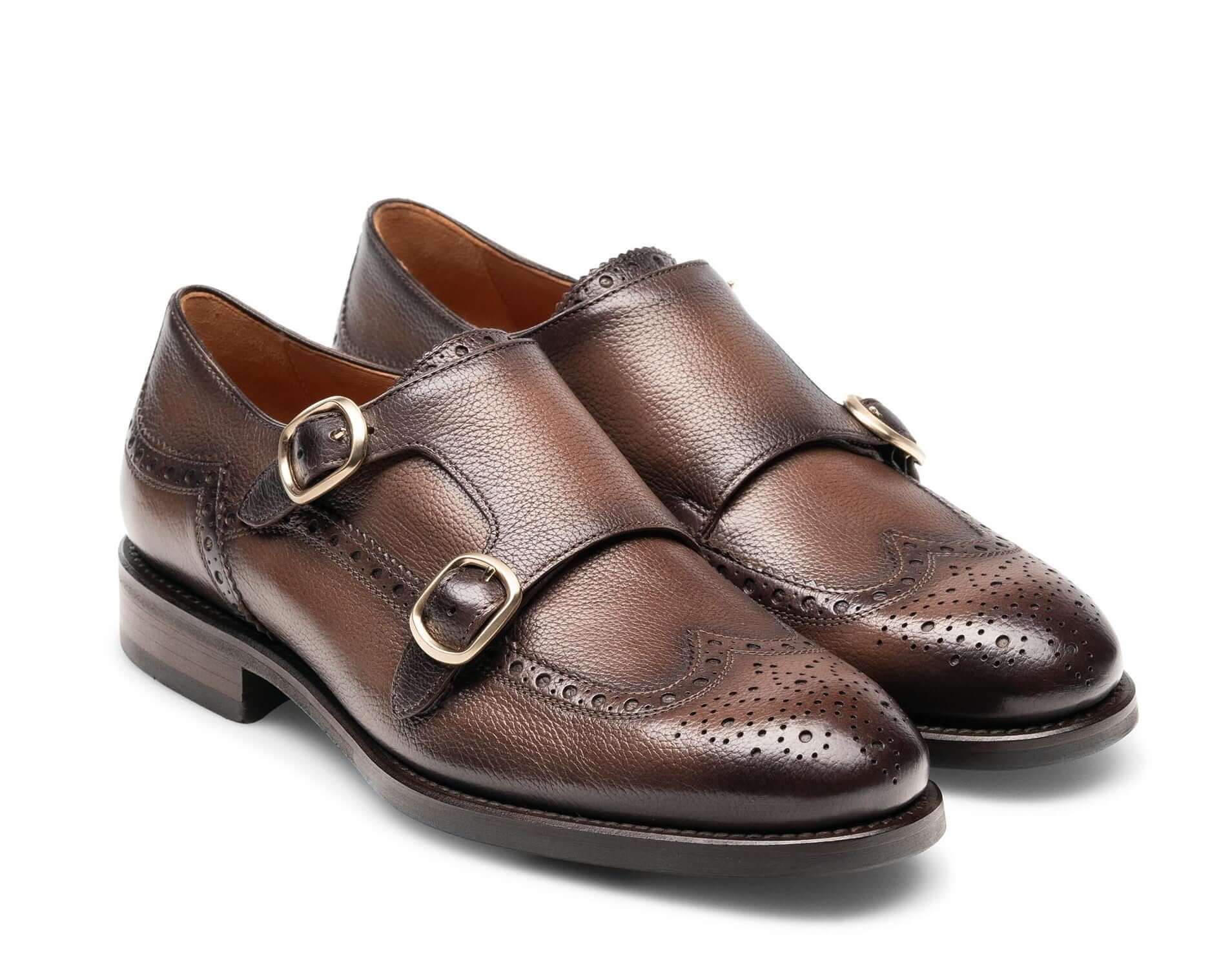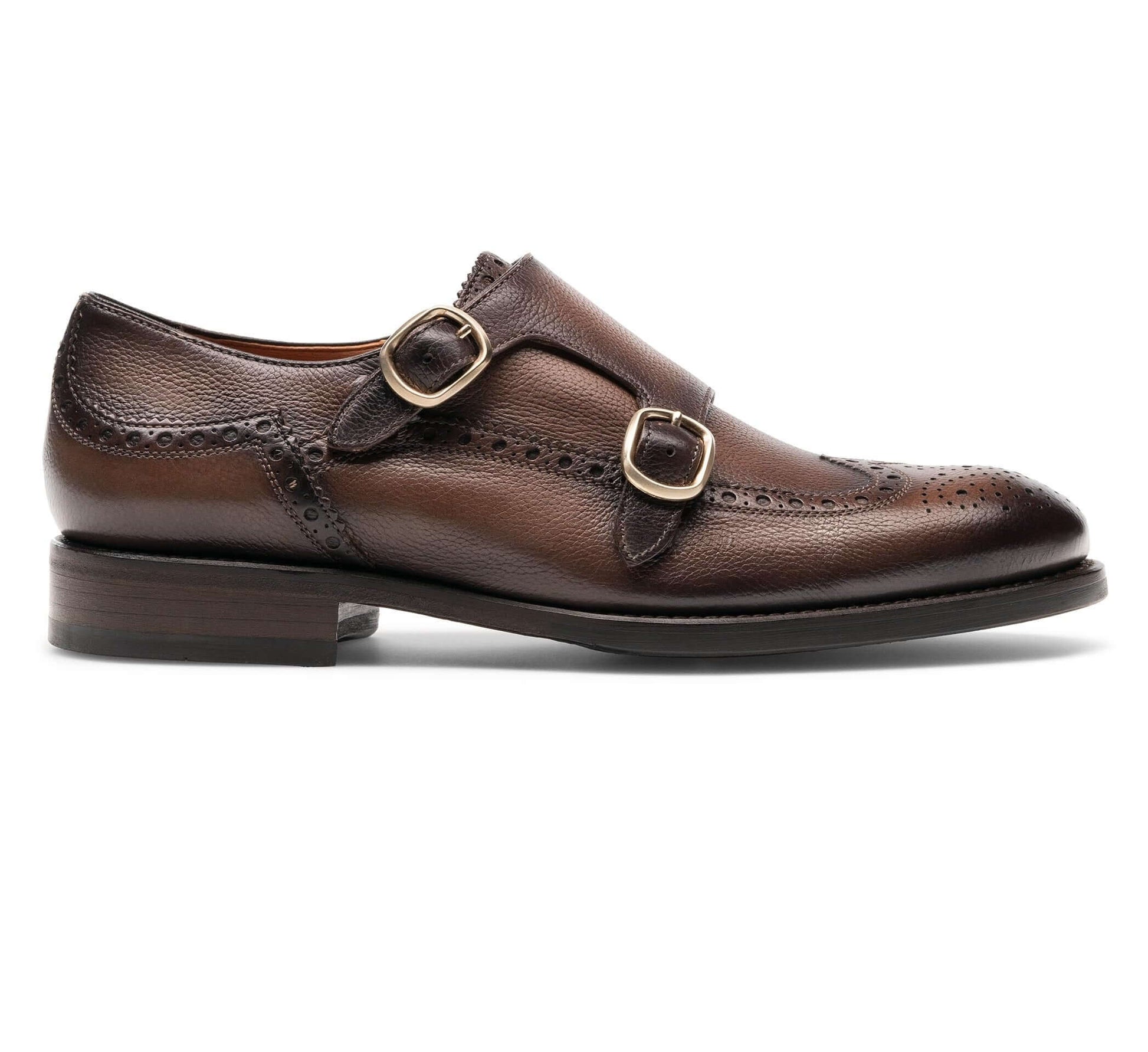 Questo è un'audace doppia fibbia con una caratteristica punta a medaglione e dettagli brogue lungo il tallone e la punta dell'ala. Il tacco basso e la suola più spessa aggiungono un volume sottile a questo stile senza tempo.