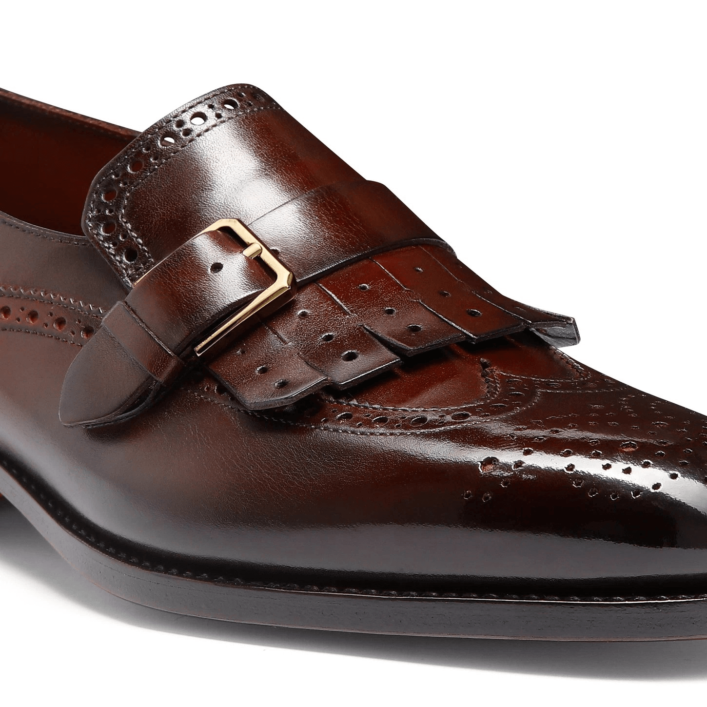 Questa mono fibbia da uomo è realizzata in pelle di alta qualità ed è decorata con il motivo brogue e la frangia dal taglio geometrico. L'elemento speciale è il trattamento artigianale con le inconfondibili velature di colore che creano un elegante effetto sfumato. Si caratterizza per la costruzione Goodyear che rende la scarpa morbida e flessibile.