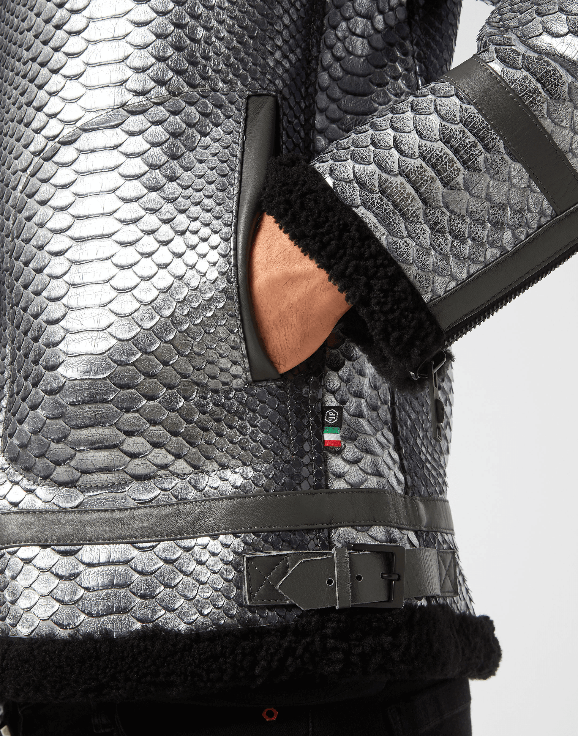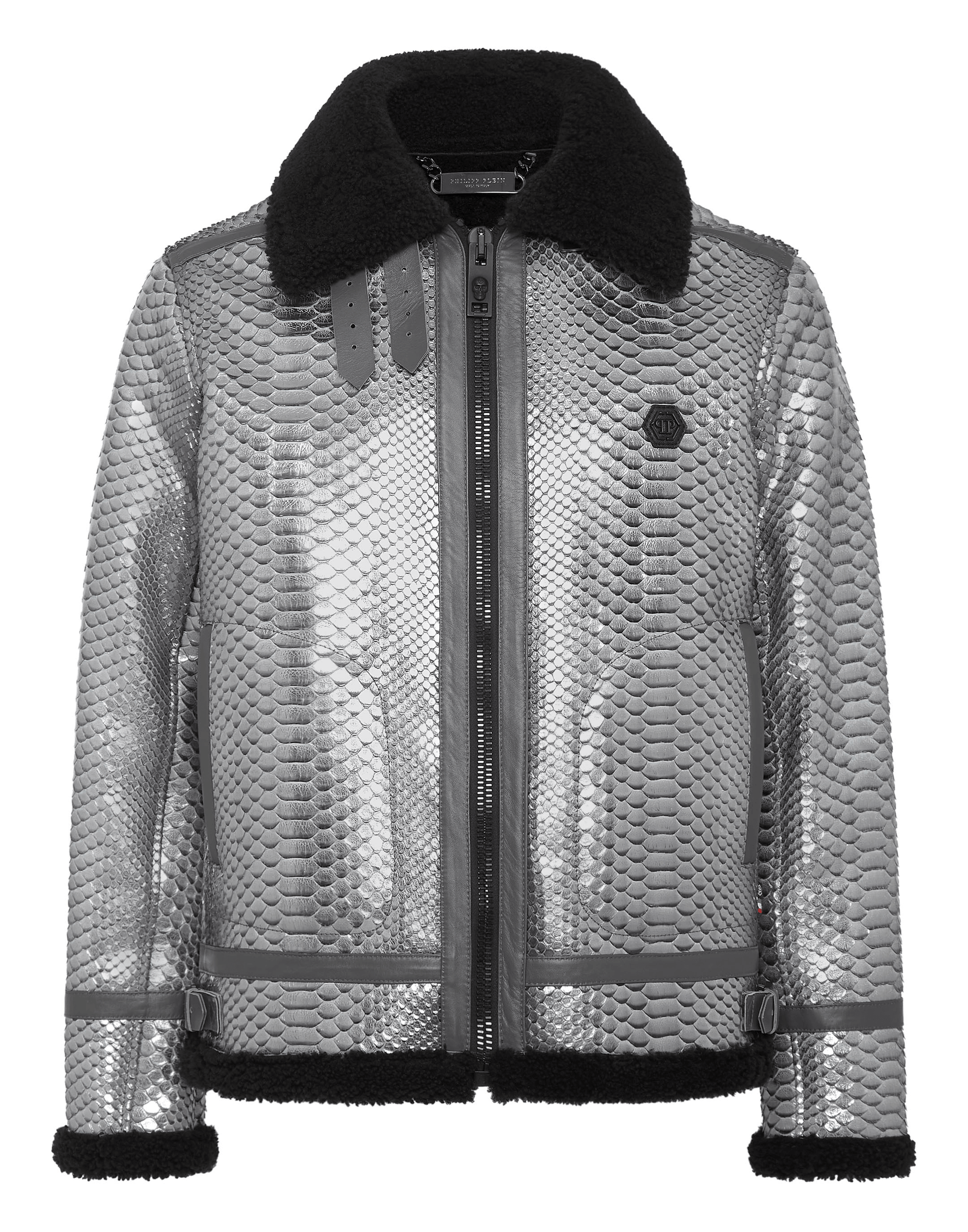 Scopri lo stile Plein con questo prezioso giubbotto realizzato in pelle di pitone. Guarda i dettagli caratterizzanti che lo rendono unico.