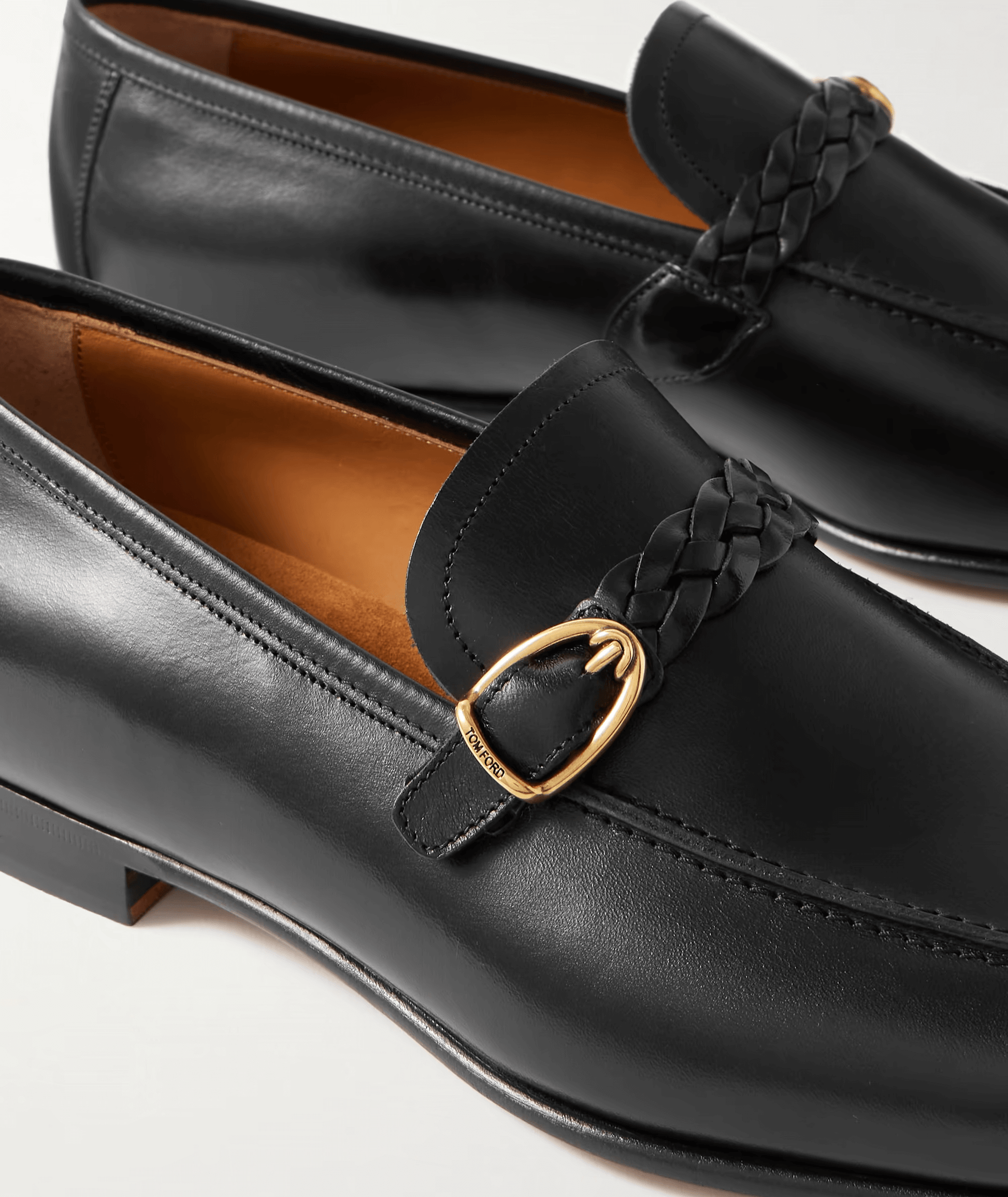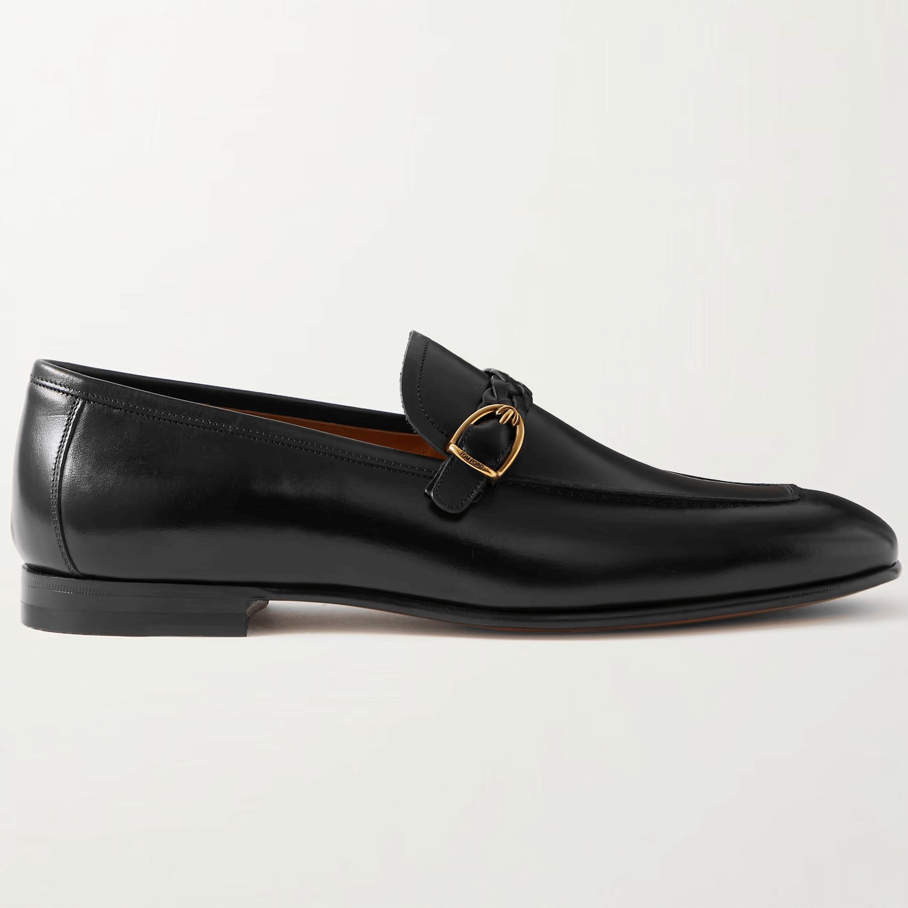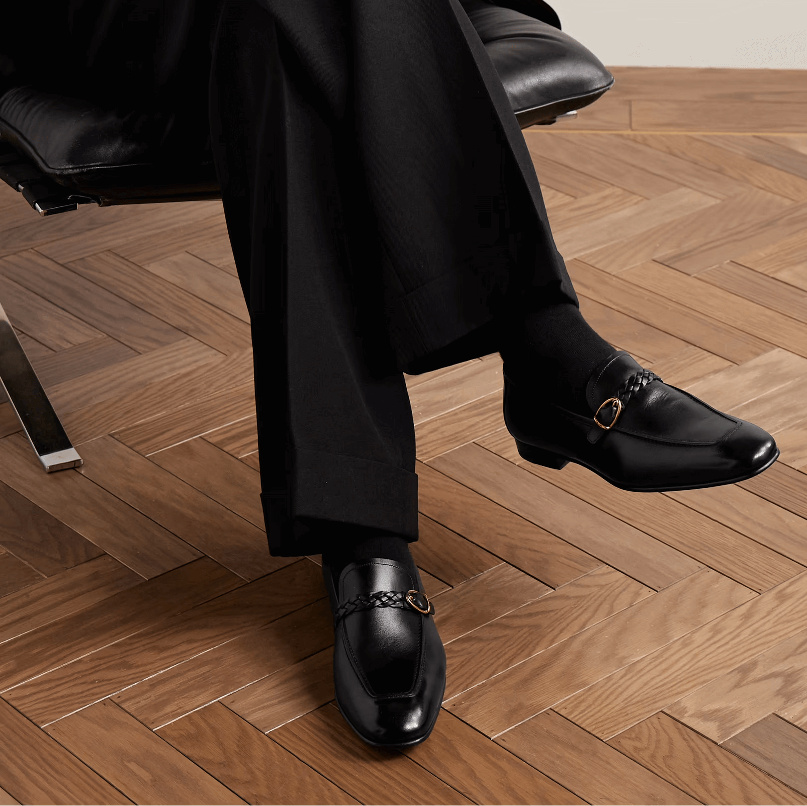 - Pelle di vitello brunita nero, fascia con treccia, punta smussata, design slip-on, soletta con logo