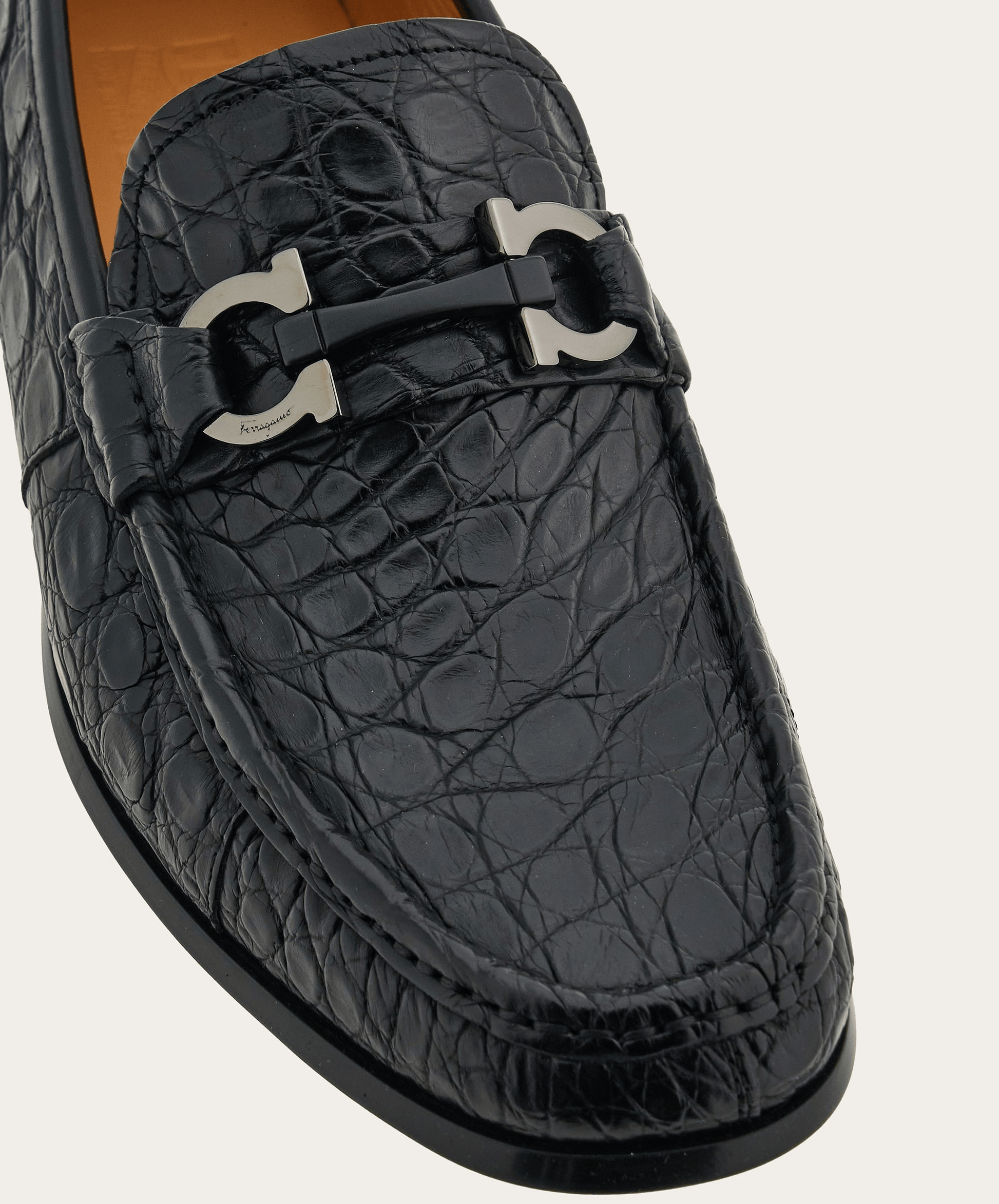 Versione preziosa del mocassino Made in Italy, con tomaia in pelle di alligatore. Le linee sono eleganti, con ornamento Gancini in finitura rutenio ed elemento centrale verniciato on tone. Suola flessibile in cuoio. Questa calzatura è realizzata con la tecnica "Tubolare", esclusiva delle scarpe di lusso: la cucitura manuale del tomaio assicura morbidezza e leggerezza eccezionali.
