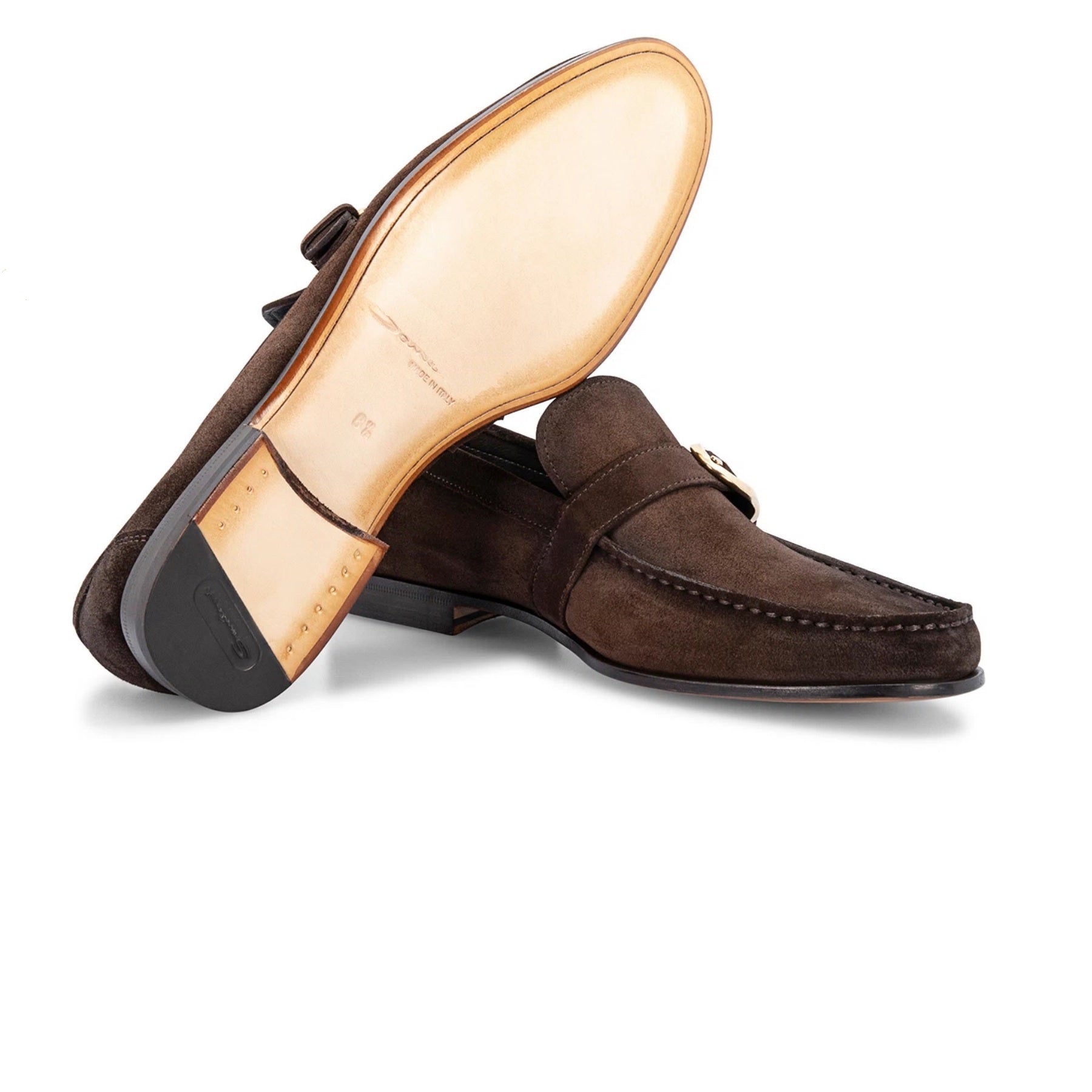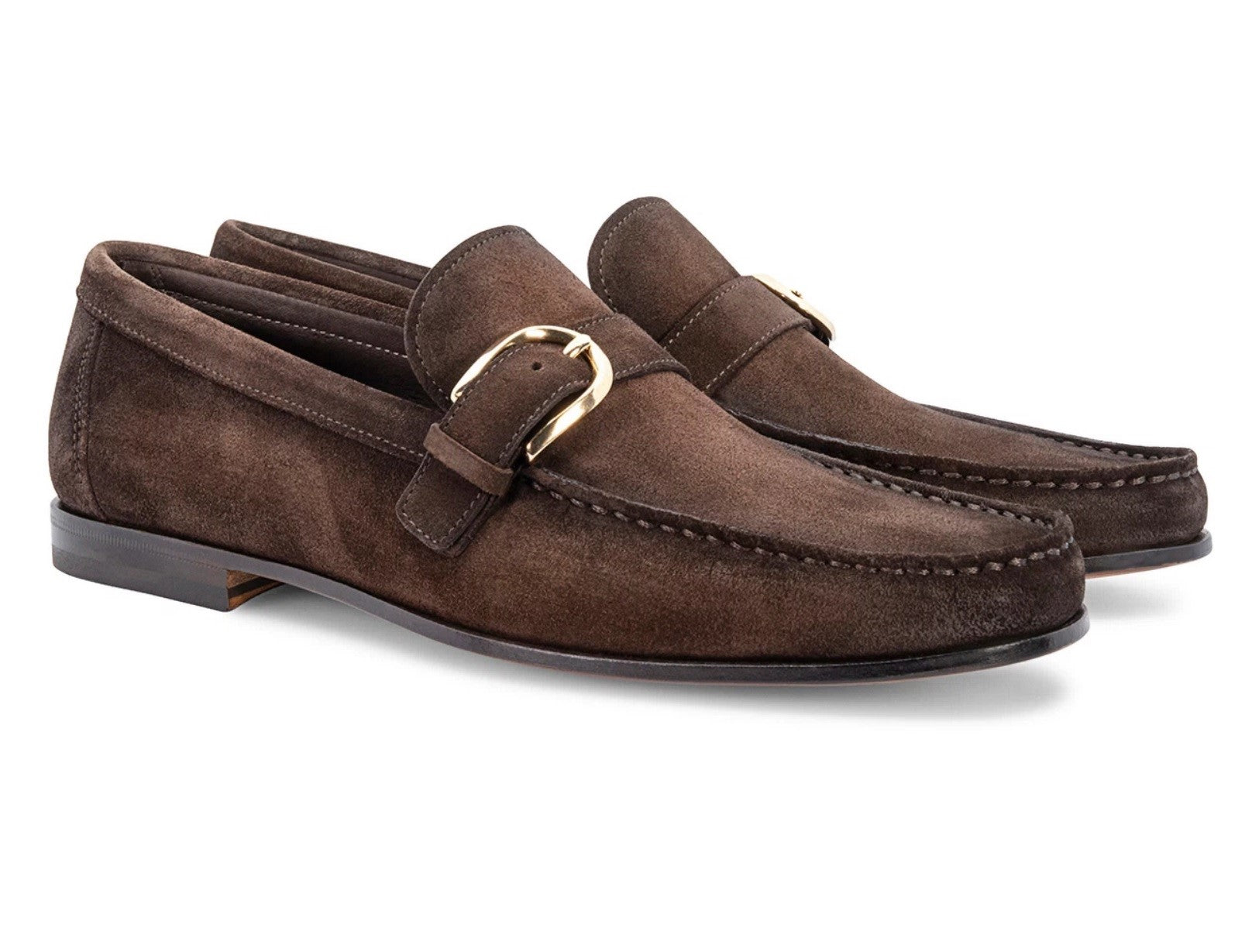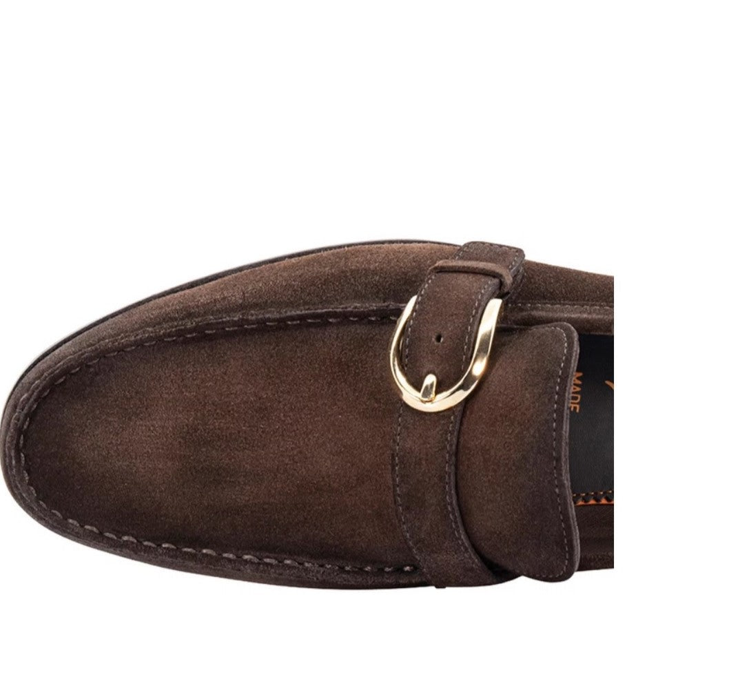 Monk straps in gray suede. A classic model with a single side buckle, finished with apron stitching and raised borders. Geometrical shape, leather sole. Made in Italy.