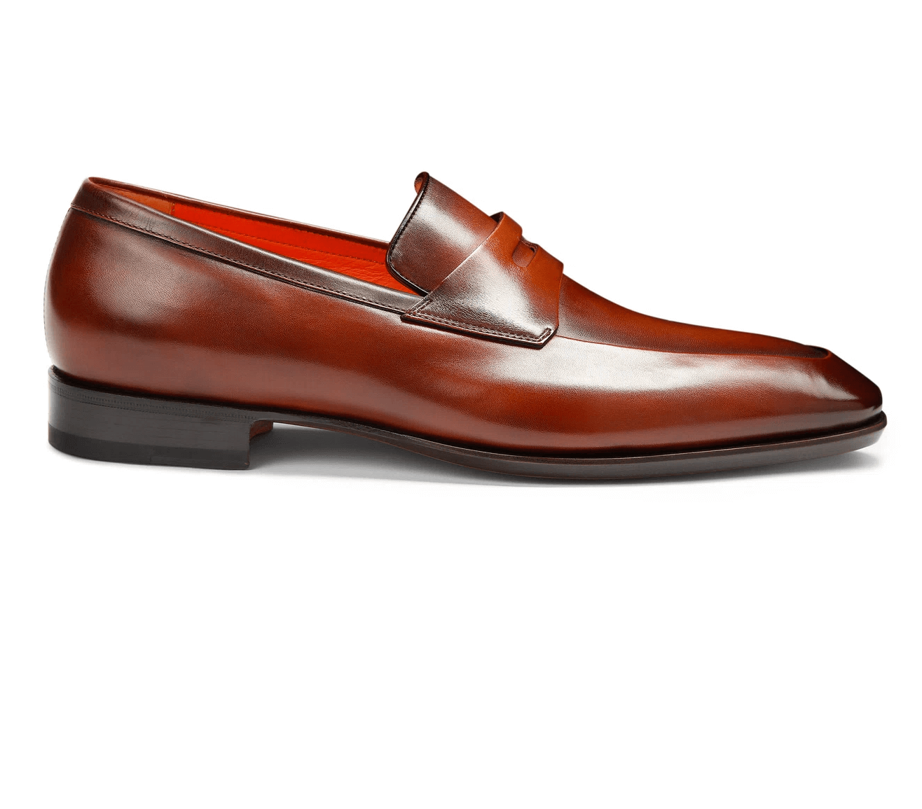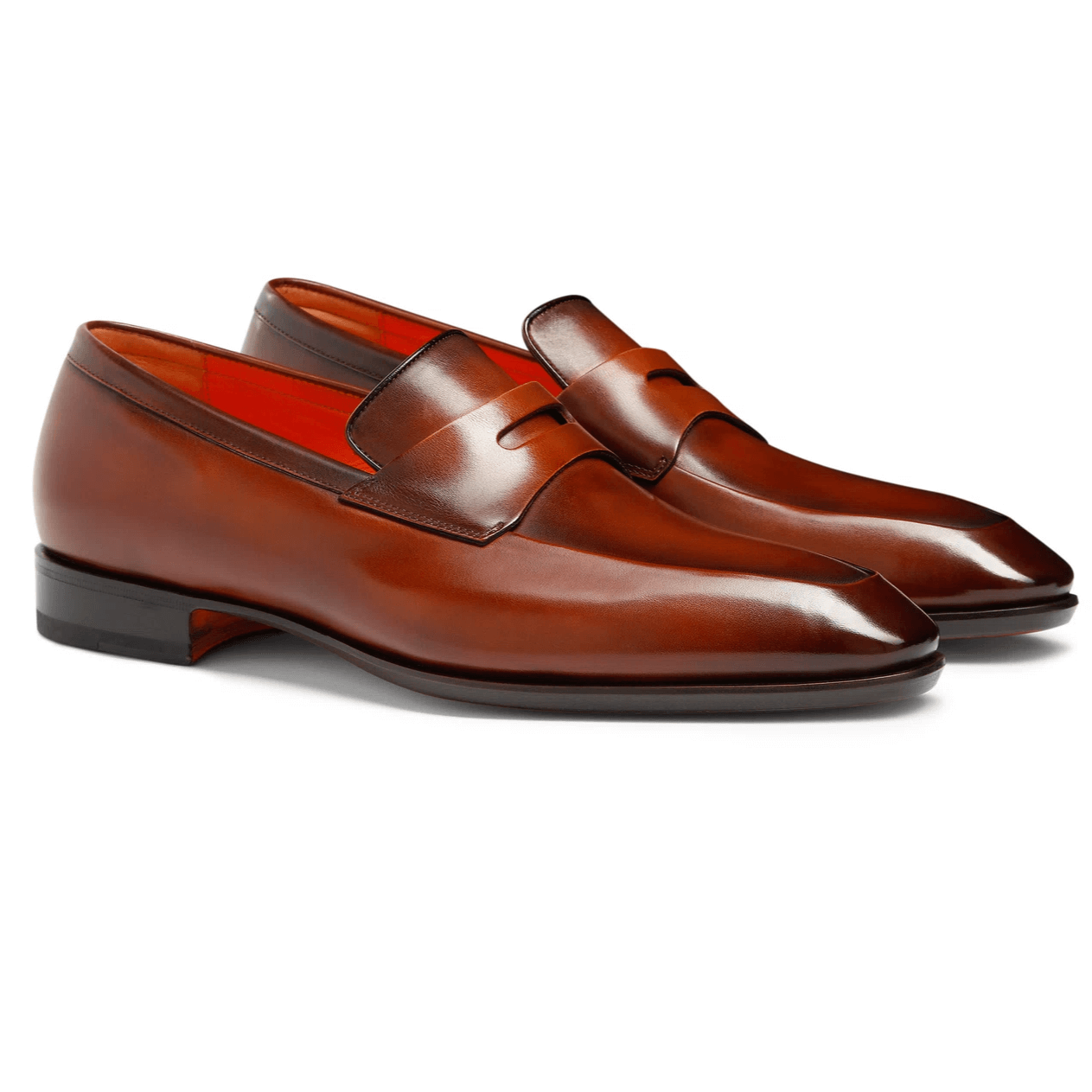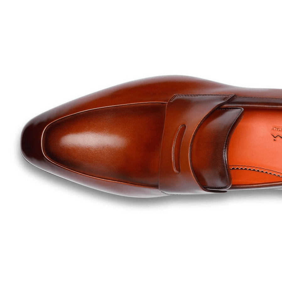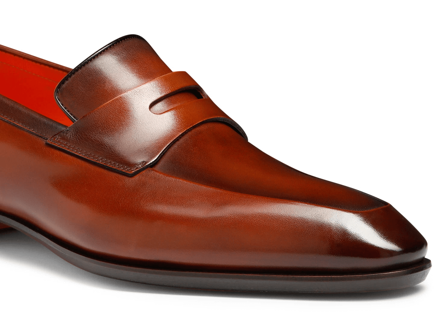 Un linguaggio stilistico sofisticato e affascinante, declinato nel design iconico del mocassino. Il modello è pensato per dare una nota esclusiva ai look più formali ed è realizzato in pelle dal finish lucido con velature di colore. Si caratterizza per la punta affusolata e il fondo in cuoio smussato verso l'interno.