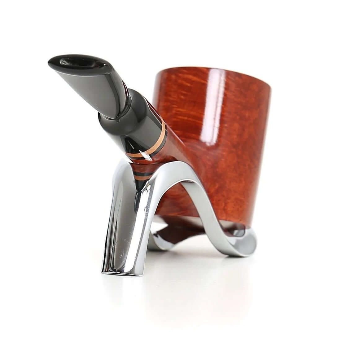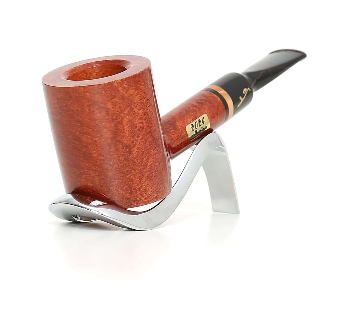 Bocchino a sella in metacrilato nero con elegante inserto colore naturale. Una placchetta in ottone che indica l'anno è incastonata sulla canna.