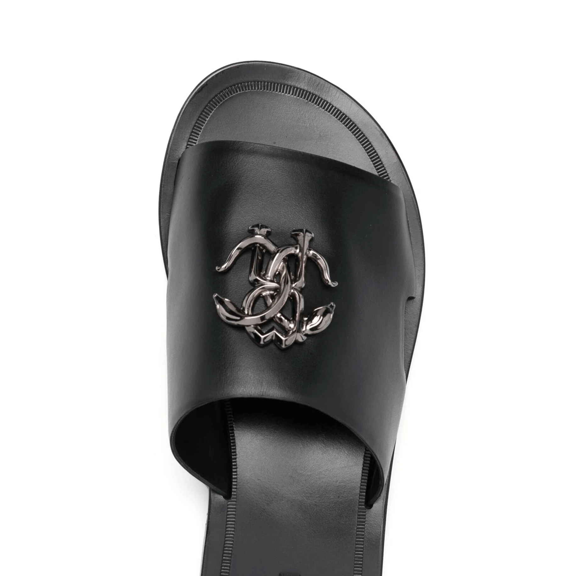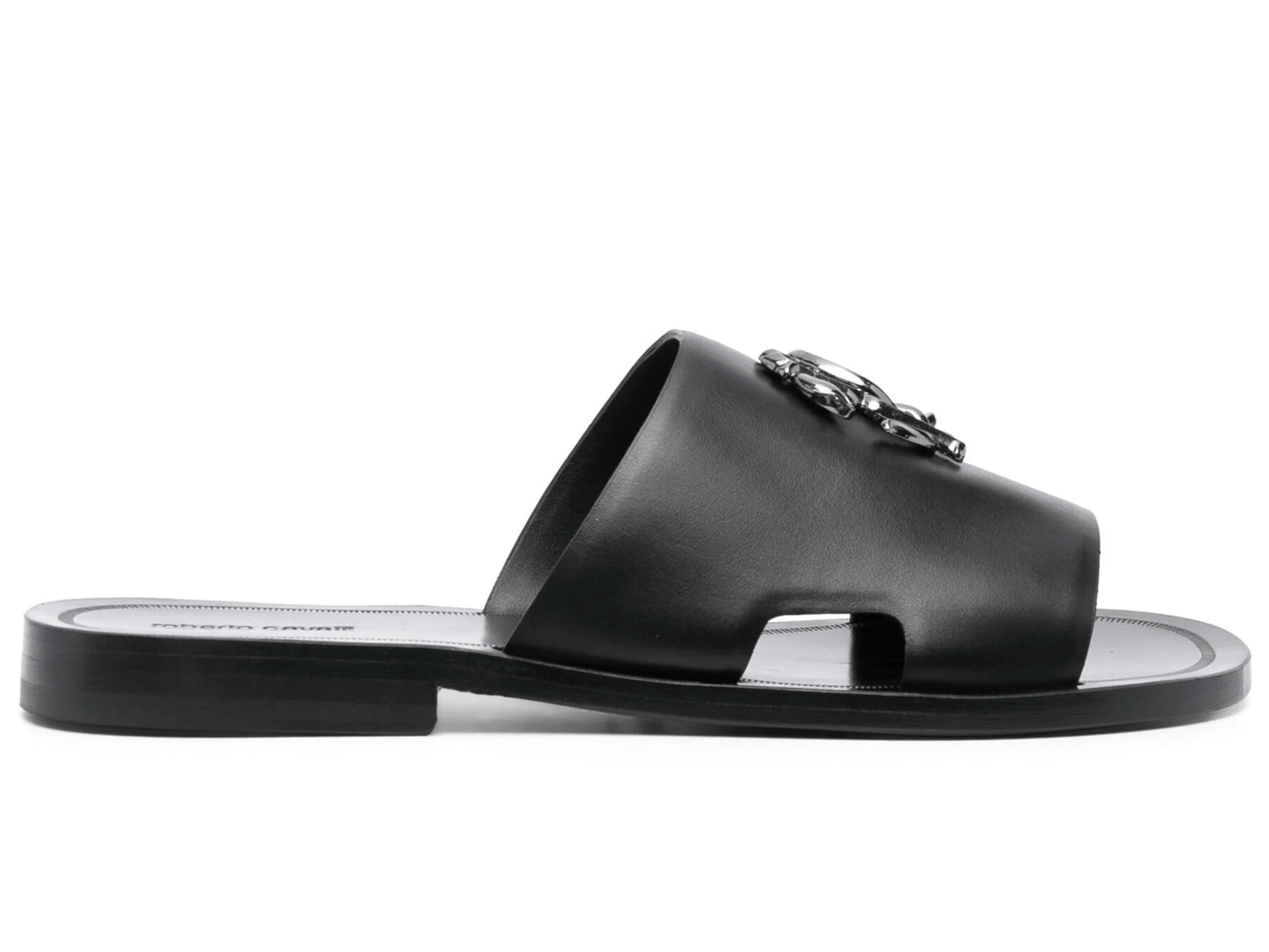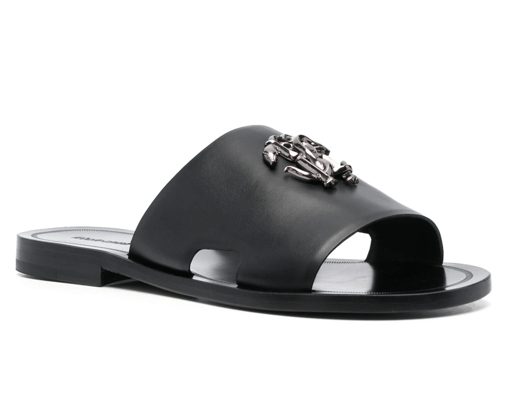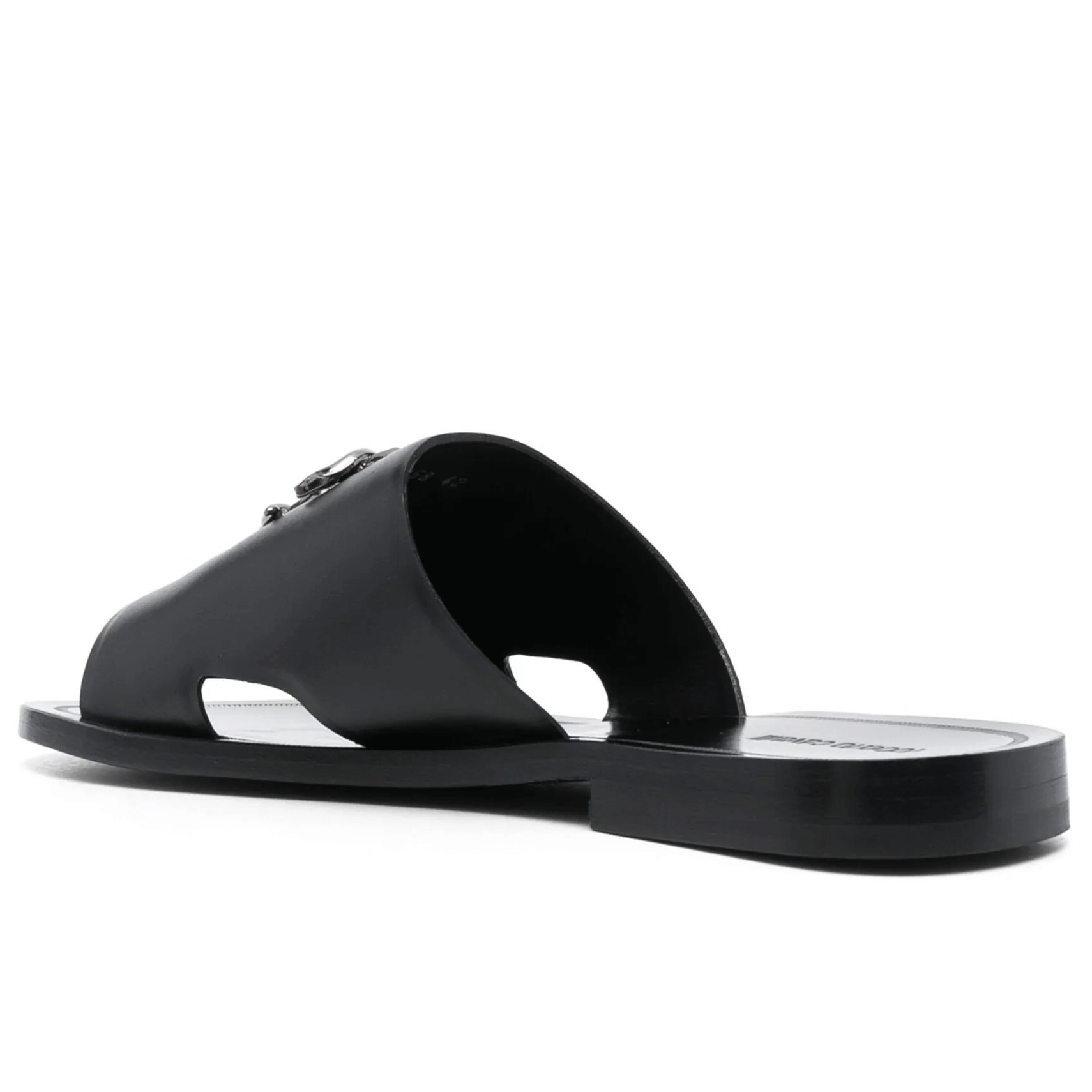 Nero, pelle di vitello, soletta in pelle con logo, placca con logo, punta aperta, fascia su un solo dito, design slip-on e suola piatta.