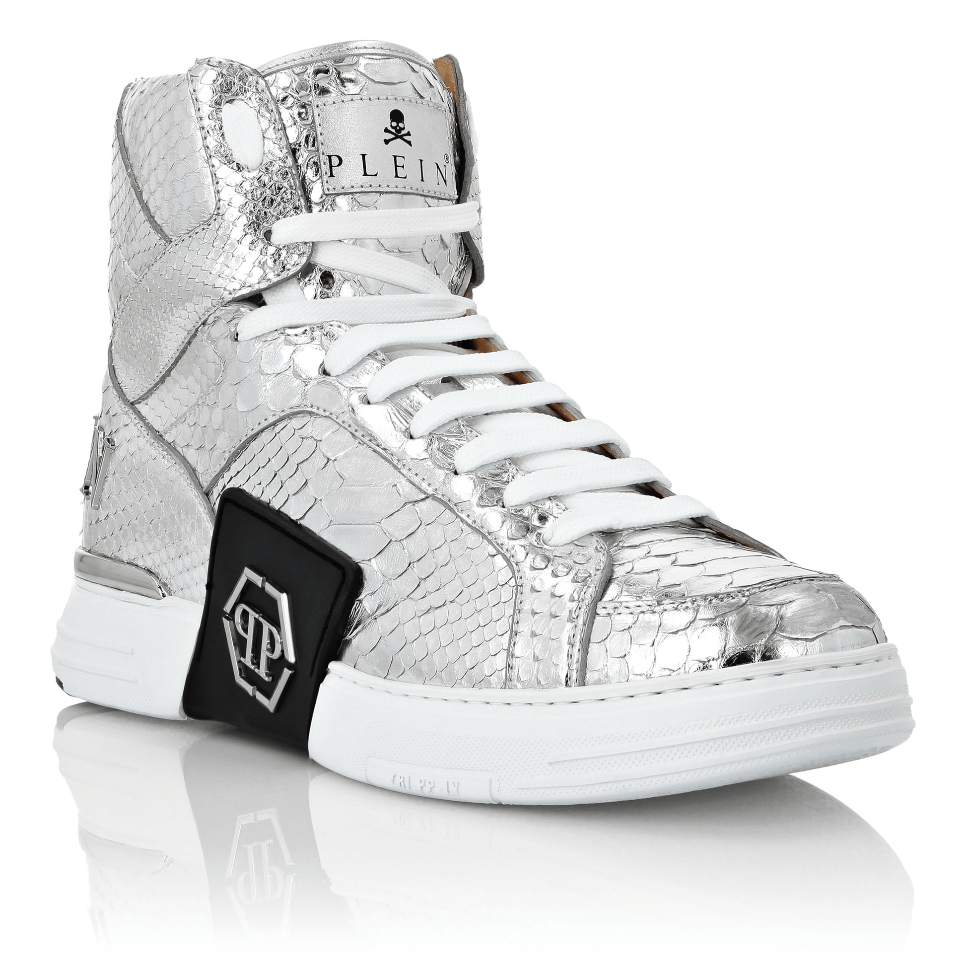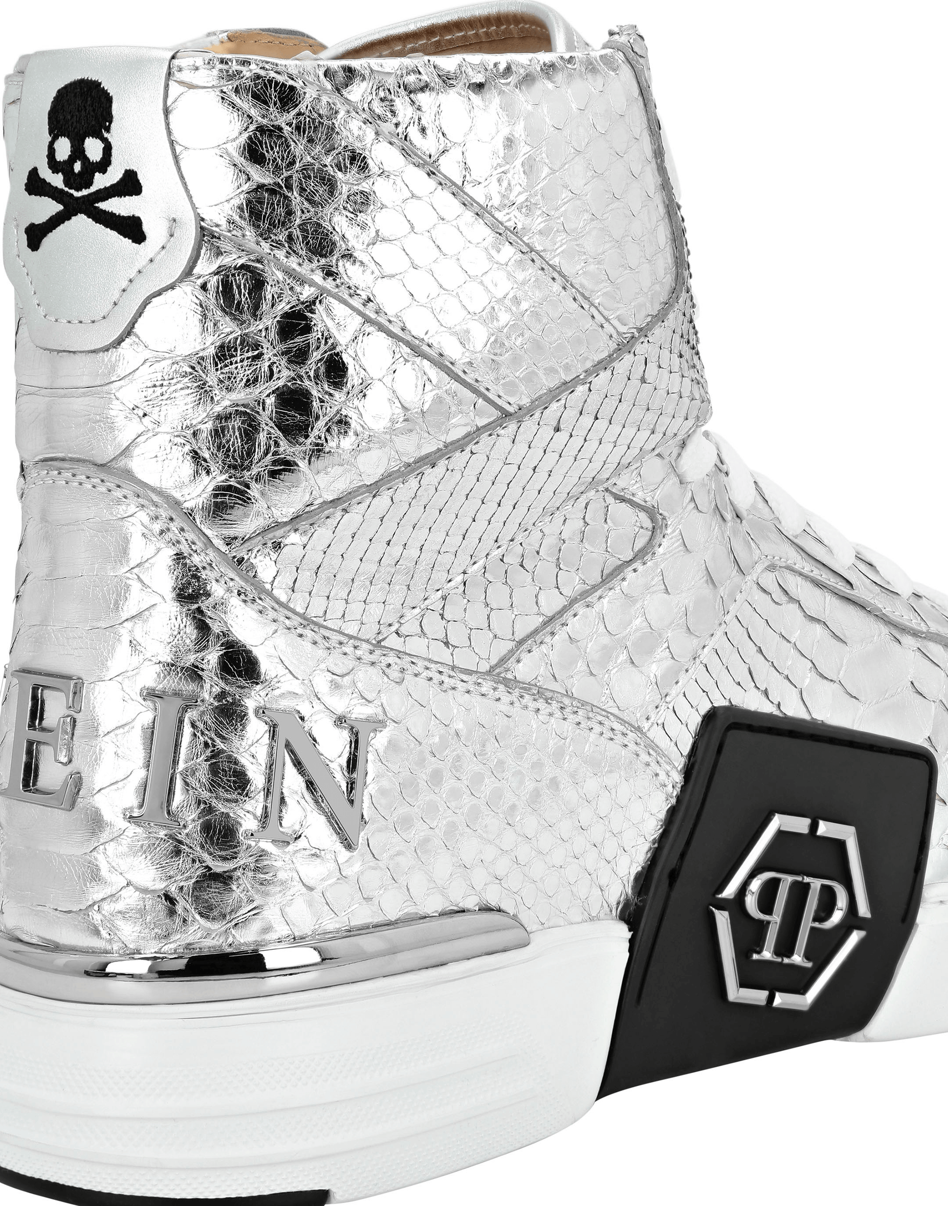 Per il tuo look sporty chic ti proponiamo un modello unisex di sneaker hi-top realizzato in pelle di pitone. L'iconico PP Hexagon è stampato a rilievo su una linguetta gommata che dalla suola sale verso la tomaia. Tutti i bordi sono imbottiti. Uno spoiler nichelato è inserito tra tallone e intersuola. La suola è di gomma antiscivolo. L'interno è foderato e la soletta è estraibile.
