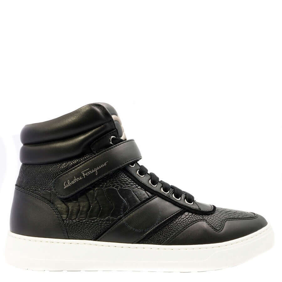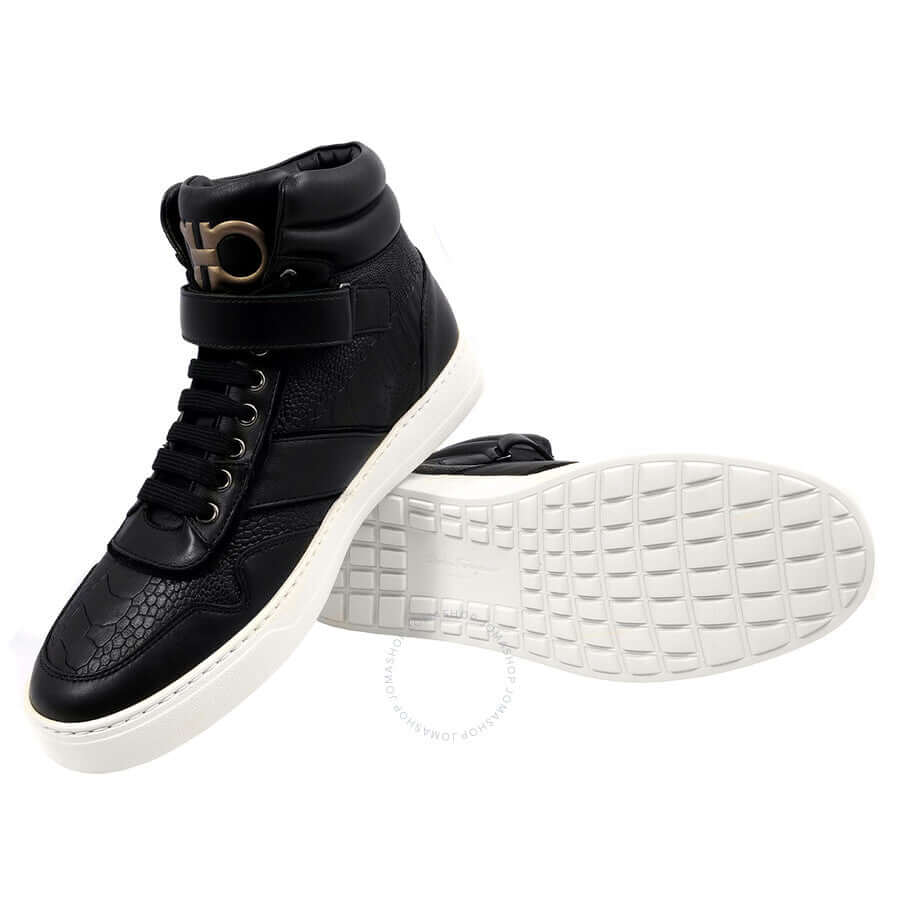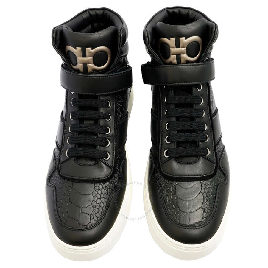 Sneaker alte di Salvatore Ferragamo presenta una suola in gomma bianca, chiusura con lacci e velcro, fodera in pelle, tomaia con effetto coccodrillo in rilievo e la firma del marchio sul cinturino. Prodotto in Italia.