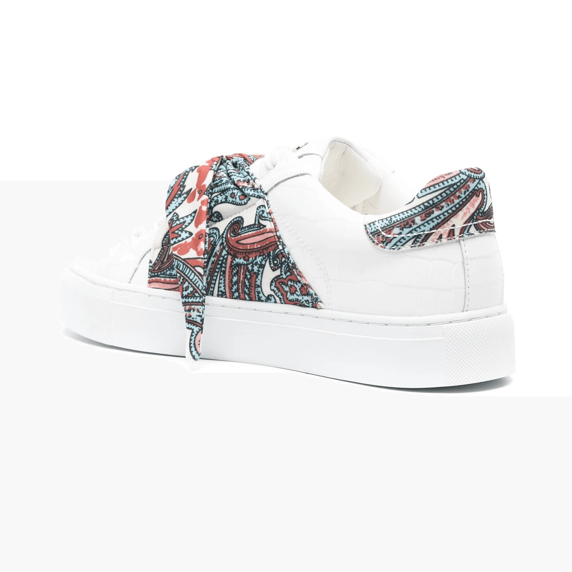 Effetto pelle di coccodrillo goffrata, stampa bandana, punta tonda, chiusura frontale con lacci, chiusura frontale con fiocco