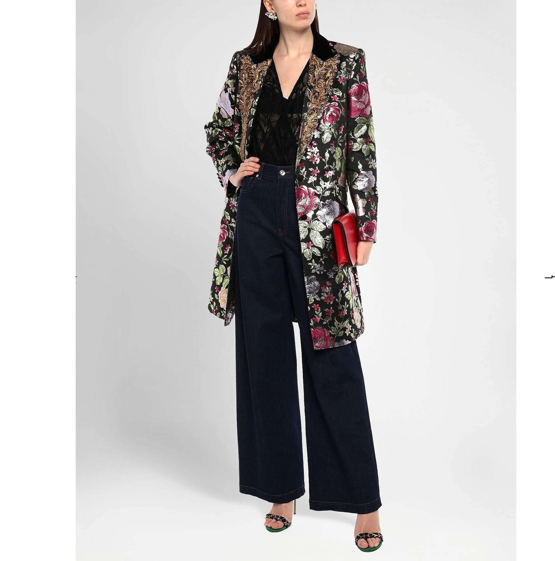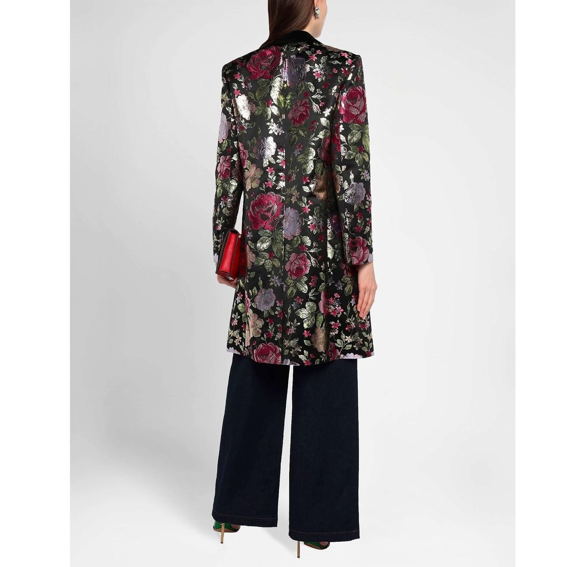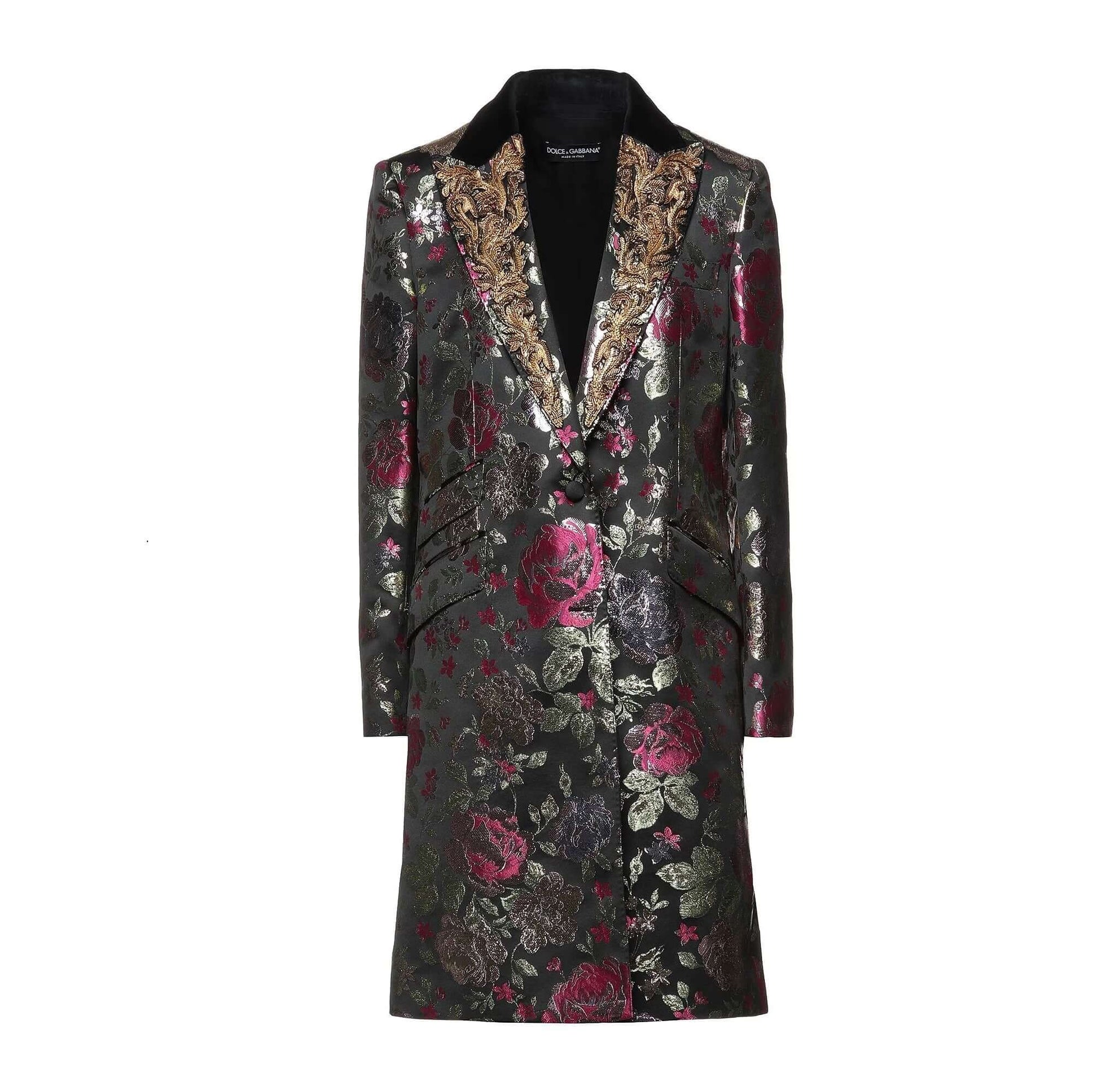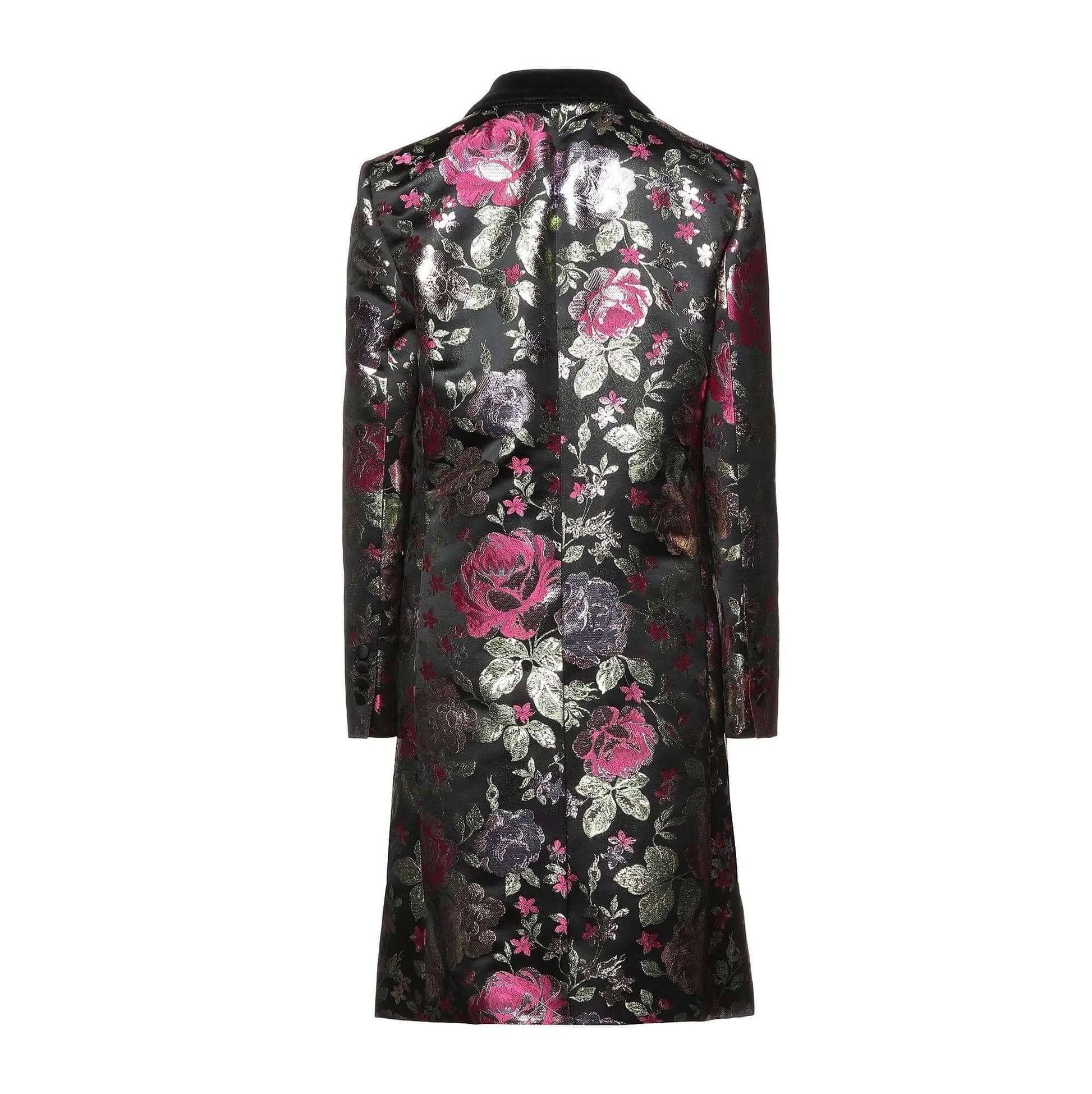 Lamè, velluto, jacquard, perline, fantasia floreale, monopetto, bottoni, collo con revers, multitasche, maniche lunghe, interno foderato, spacco sul retro
