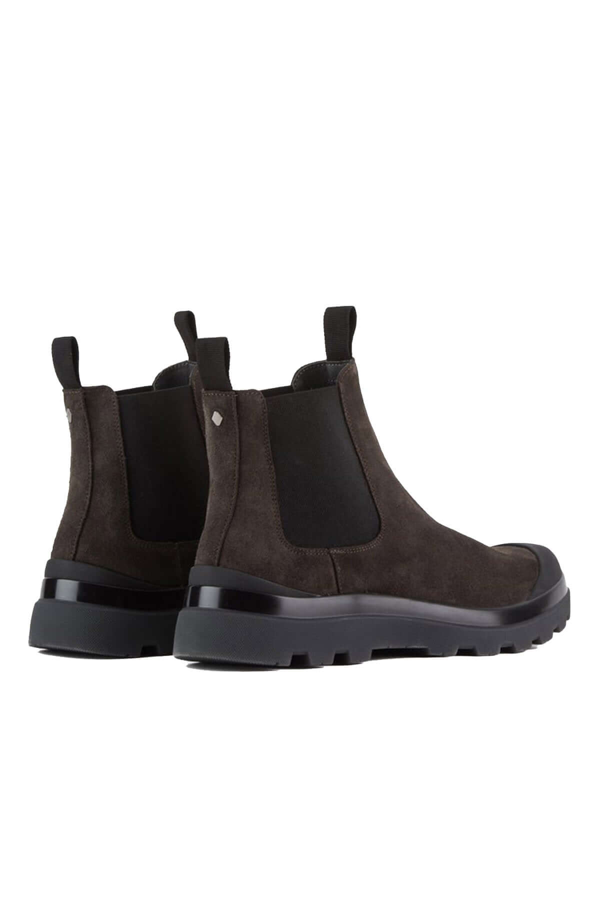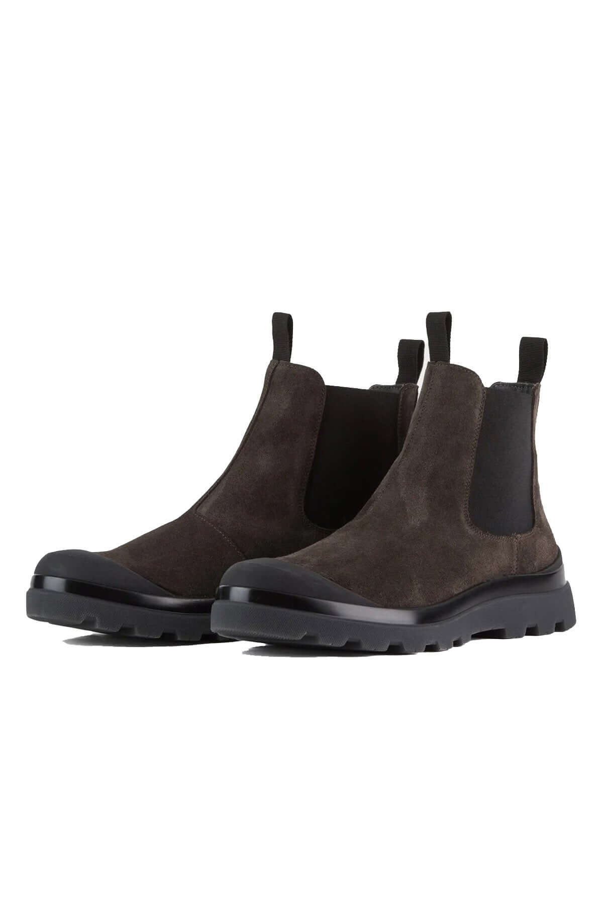 Stivaletti con tomaia in suede marrone ebano, foderati in microfibra. Suola di 2,5 cm dal design a forma di ''guscio'' ed elastici laterali neri. La linea P03 è estremamente protettiva con un gusto tecno-cool a prova di globe-trotter.