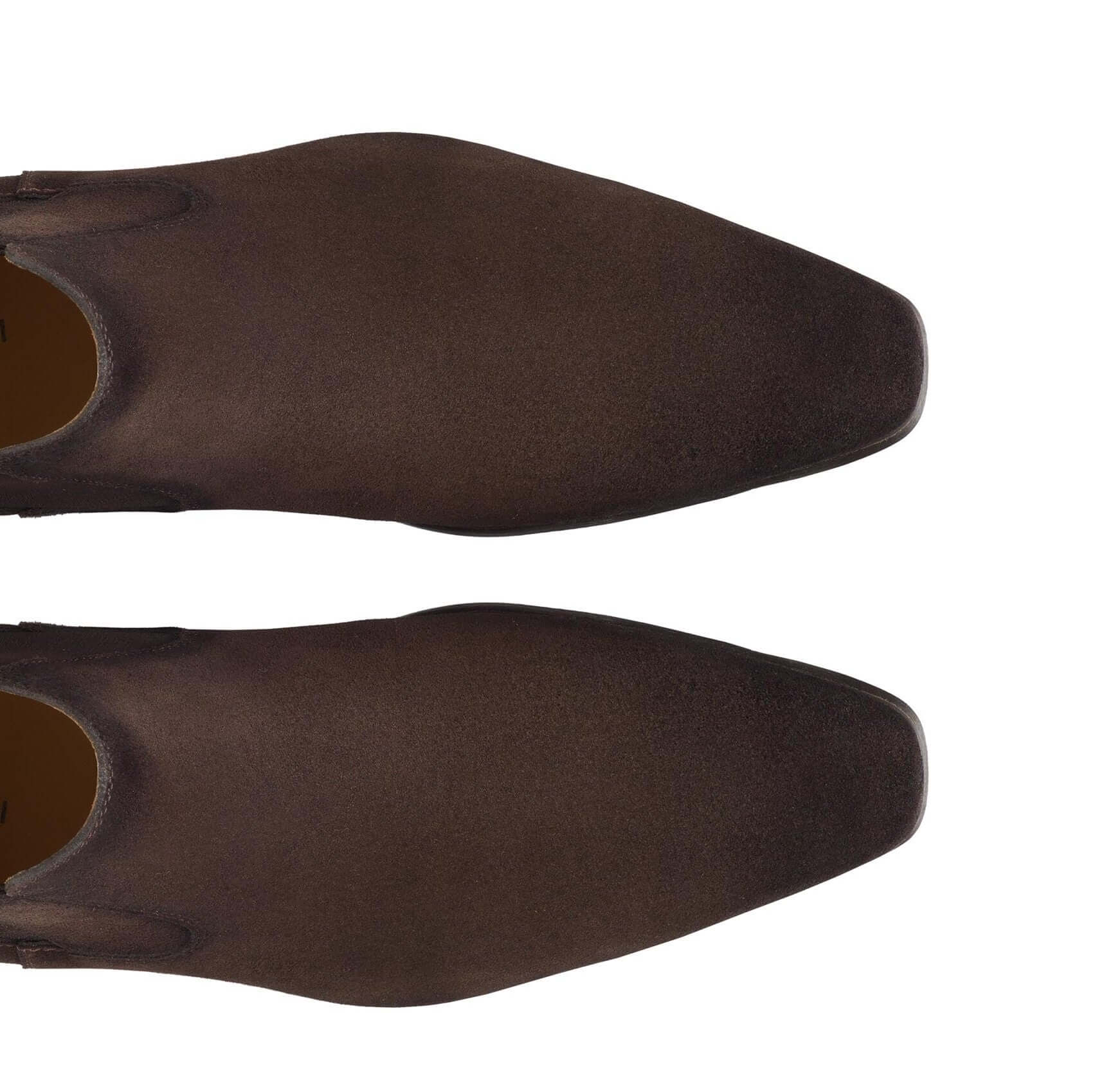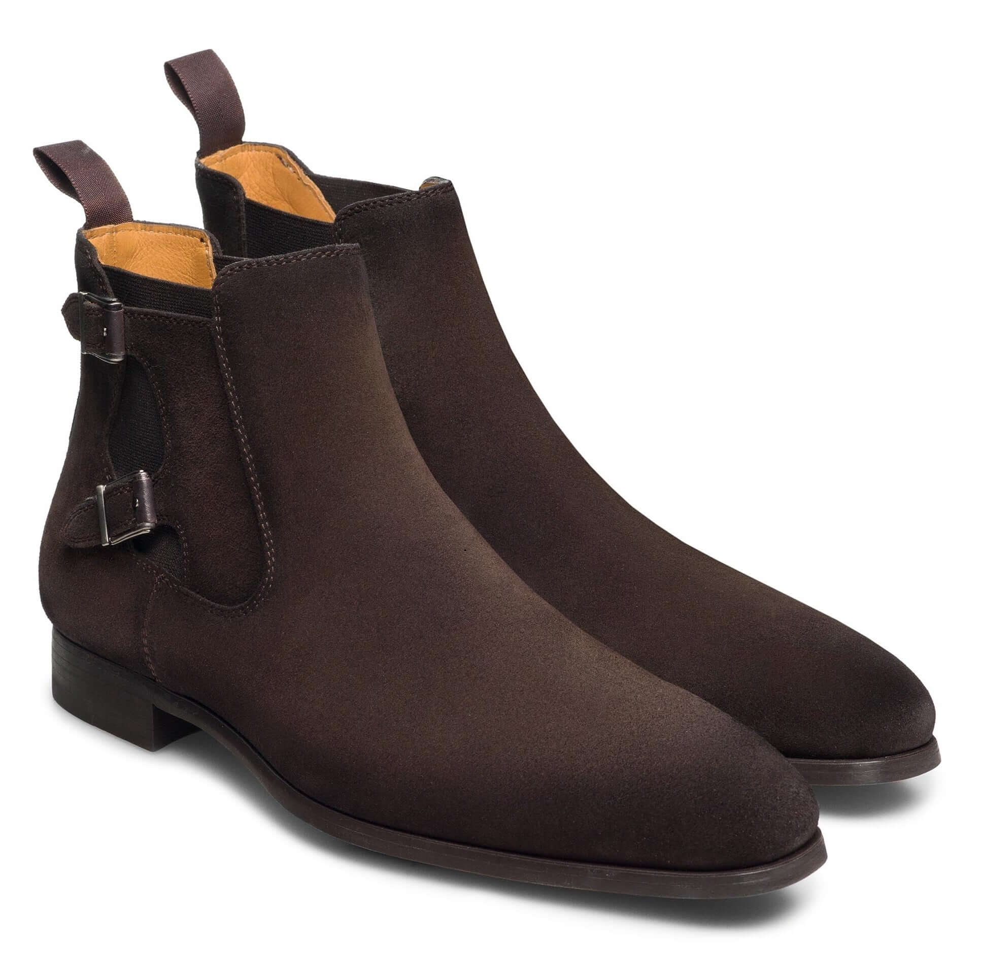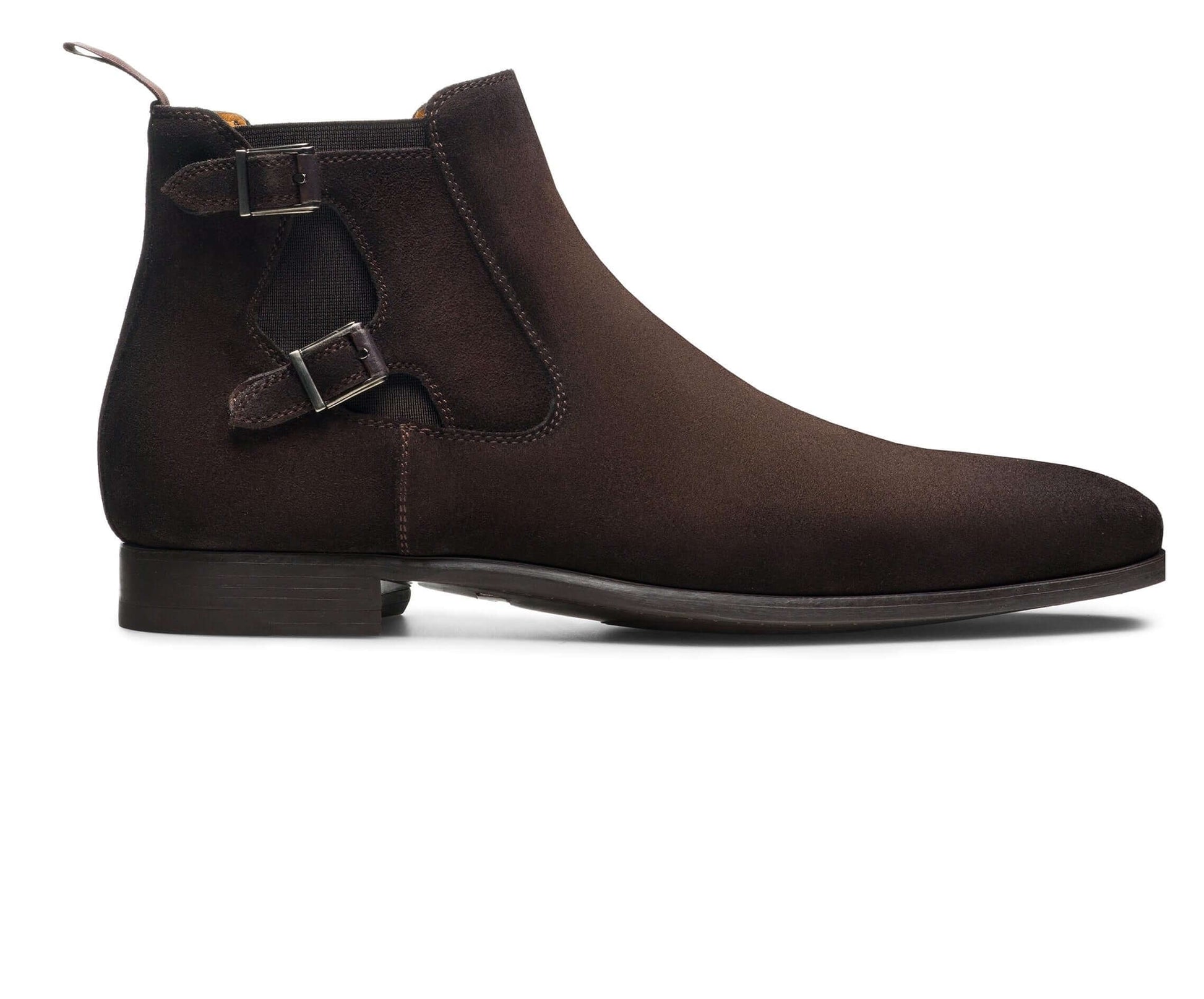 Pelle scamosciata marrone. Stivaletto Chelsea modificato presenta una chiusura con fibbia a doppia fibbia a fibbia sopra l'elastico gore per un look elevato. La finitura pulita e minimale completa la semplice raffinatezza della silhouette allungata