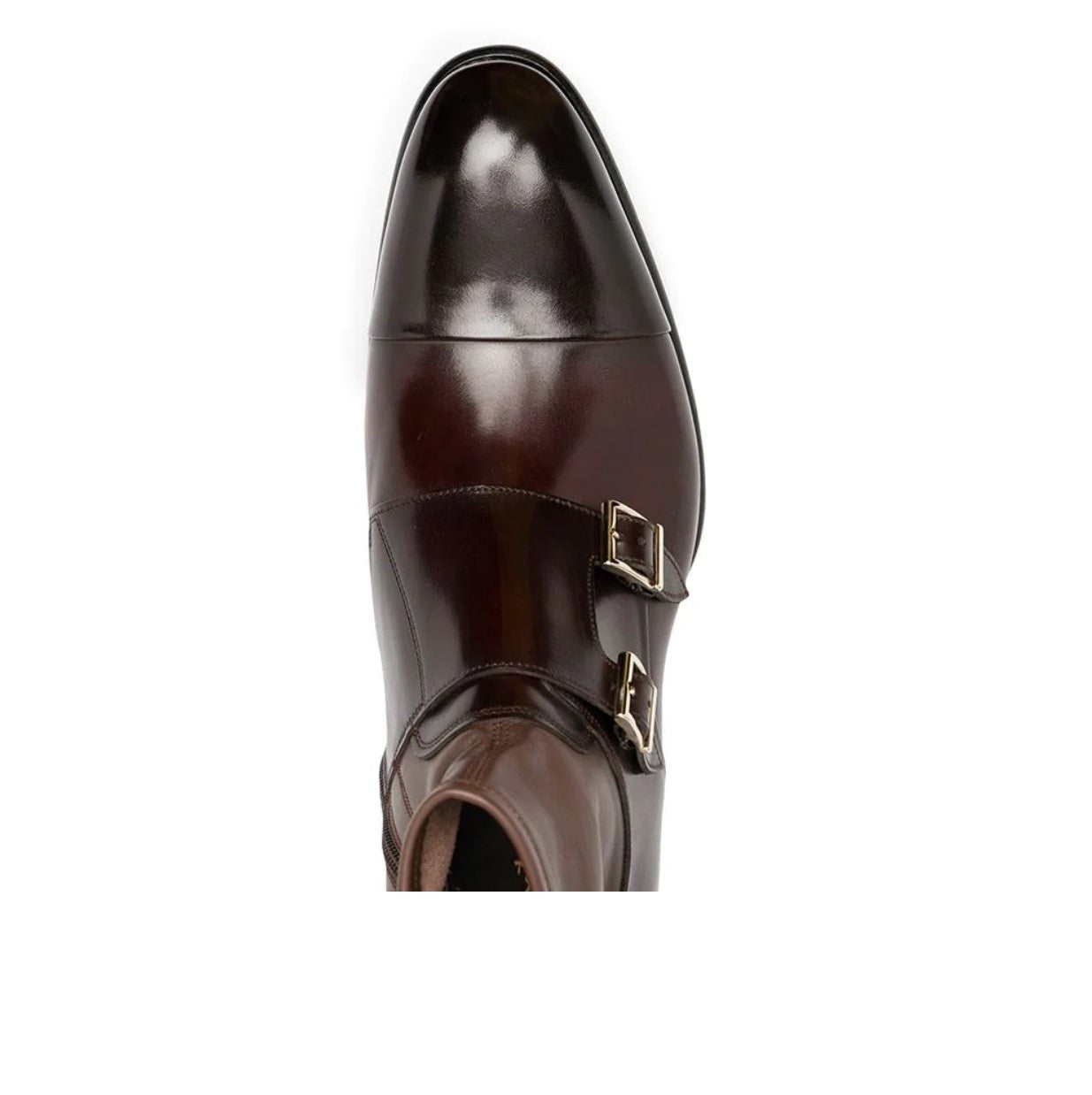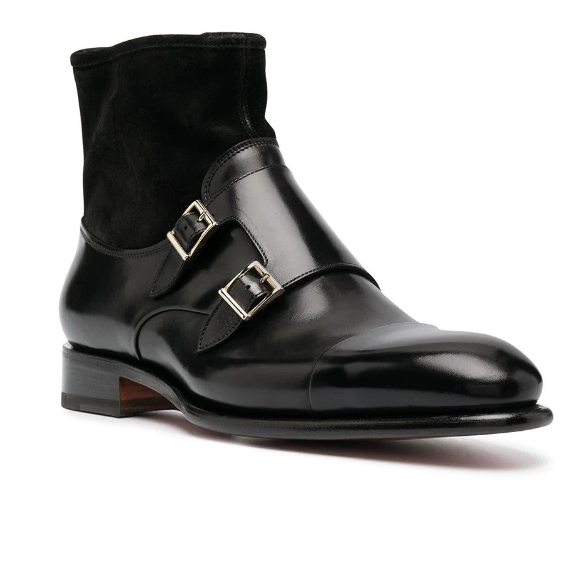 Punta tonale, chiusura stile monk, soletta con logo, chiusura laterale con zip e tacco lamellato.