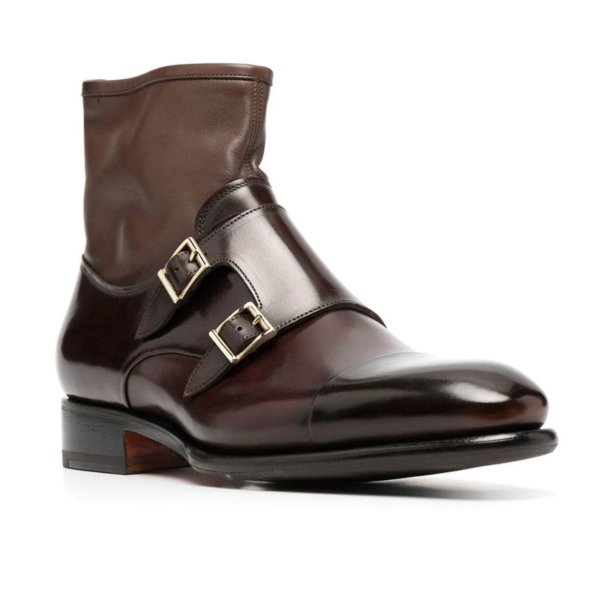 Punta tonale, chiusura stile monk, soletta con logo, chiusura laterale con zip e tacco lamellato.