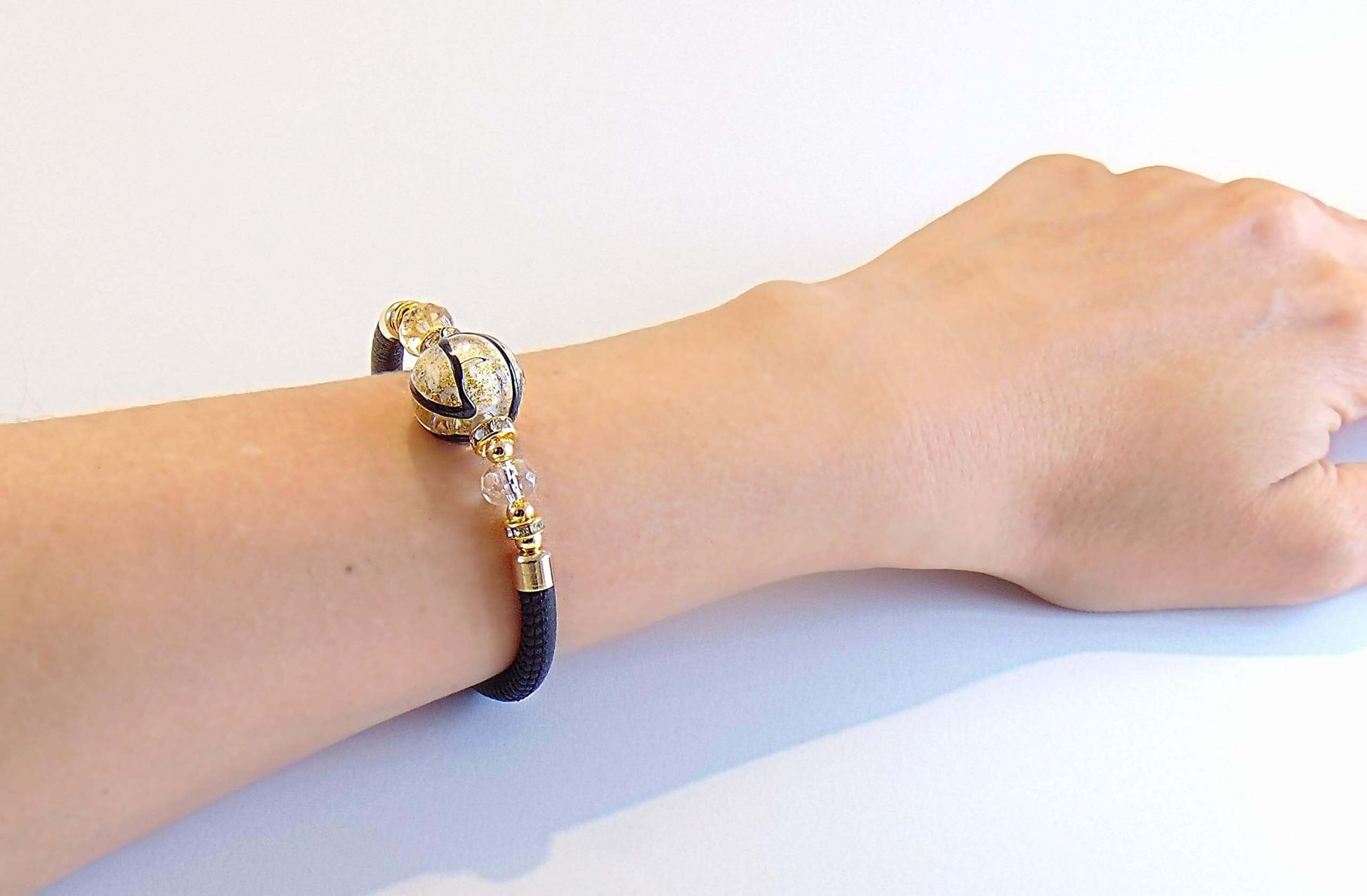 Bracciale da Donna con perle in Vetro di Murano Originale e vera pelle Toscana, Collezione Aida, con foglia in argento e oro 24kt,