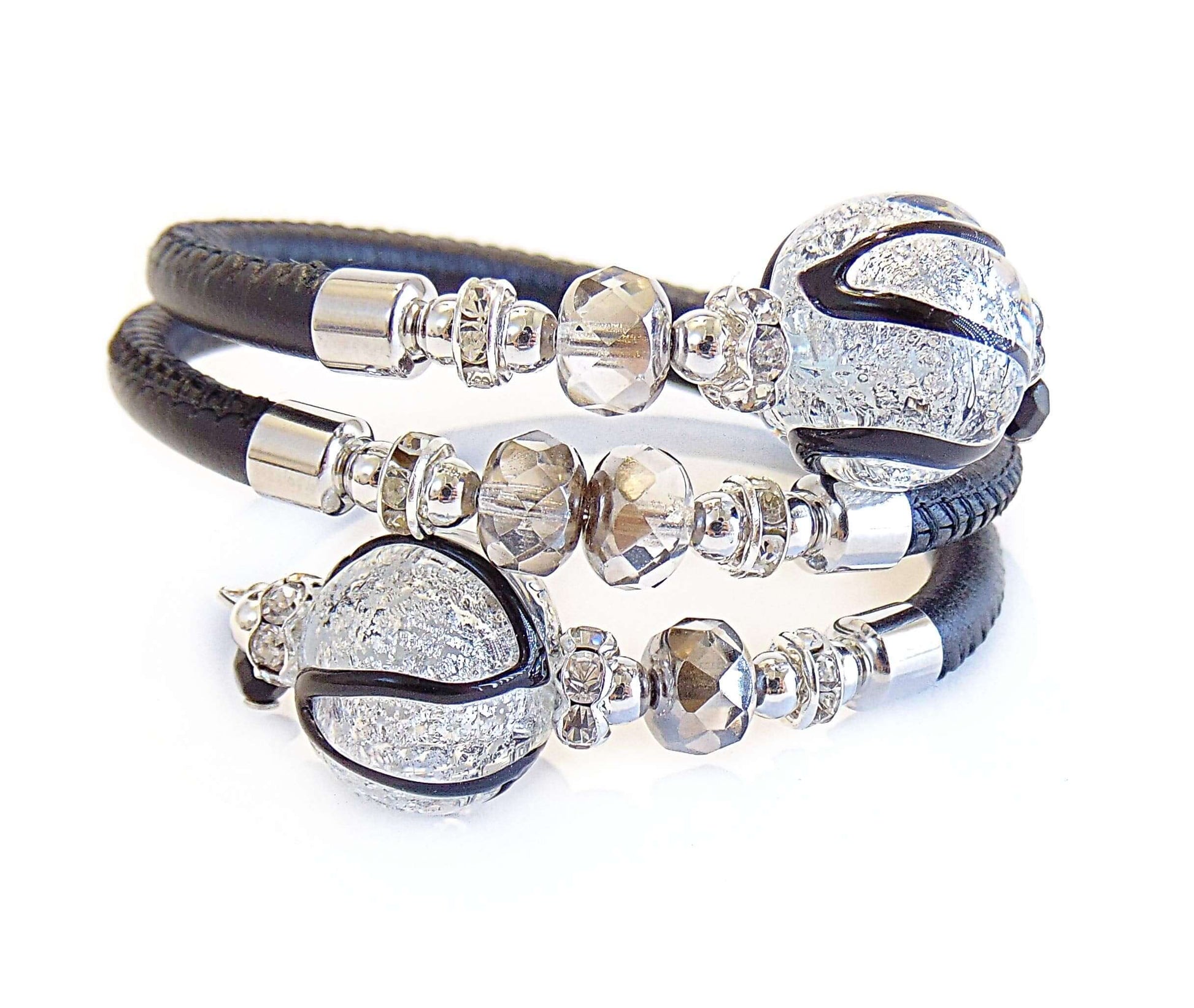 Bracciale da Donna con perle in Vetro di Murano Originale e vera pelle Toscana, Collezione Aida, modello Contrarie con foglia in oro 24kt, Made in Italy certificato