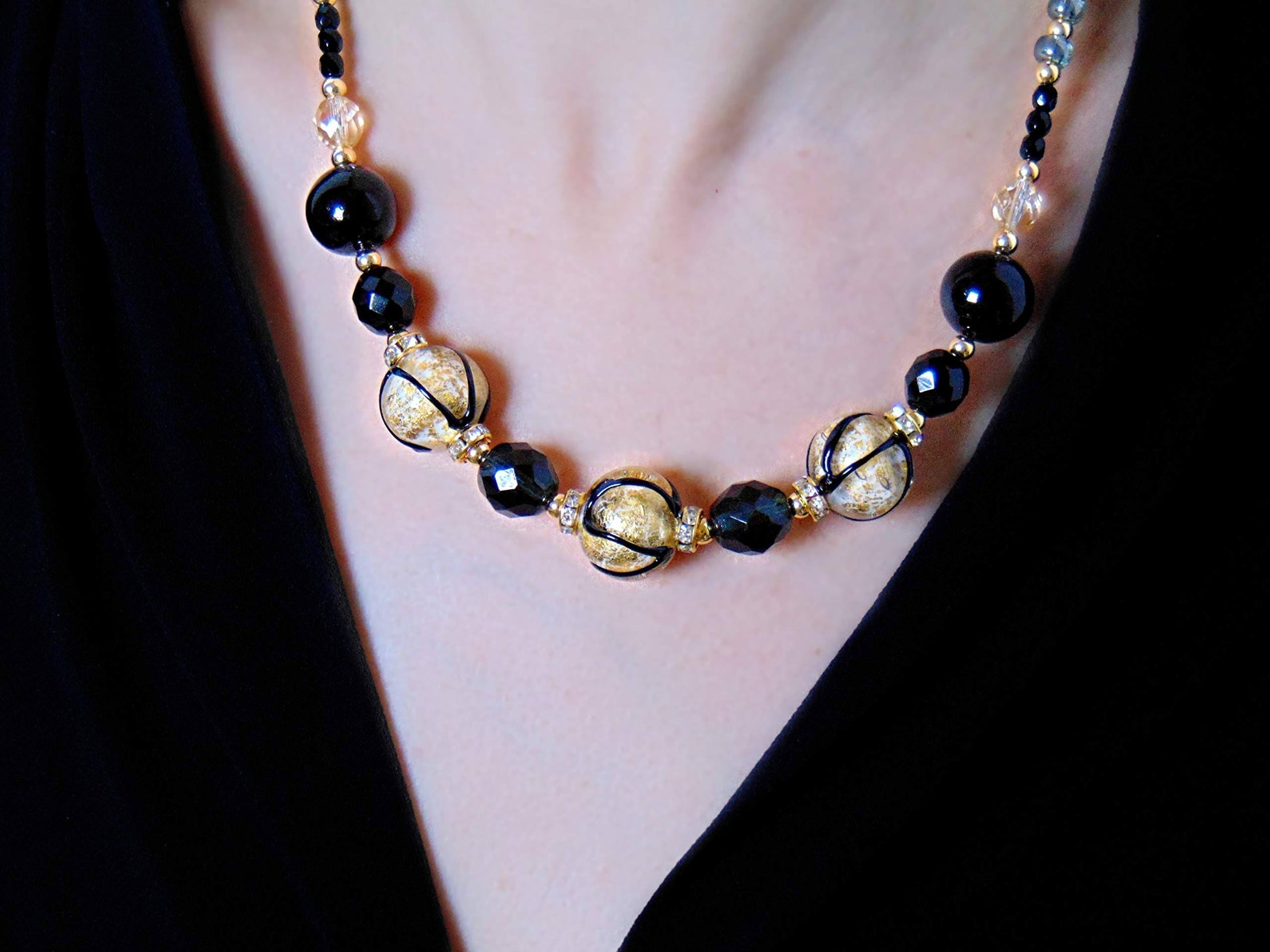 Collana da Donna girocollo con perle in Vetro di Murano Originale, perle in vetro con foglia in oro 24kt e venature nere, Made in Italy certificato